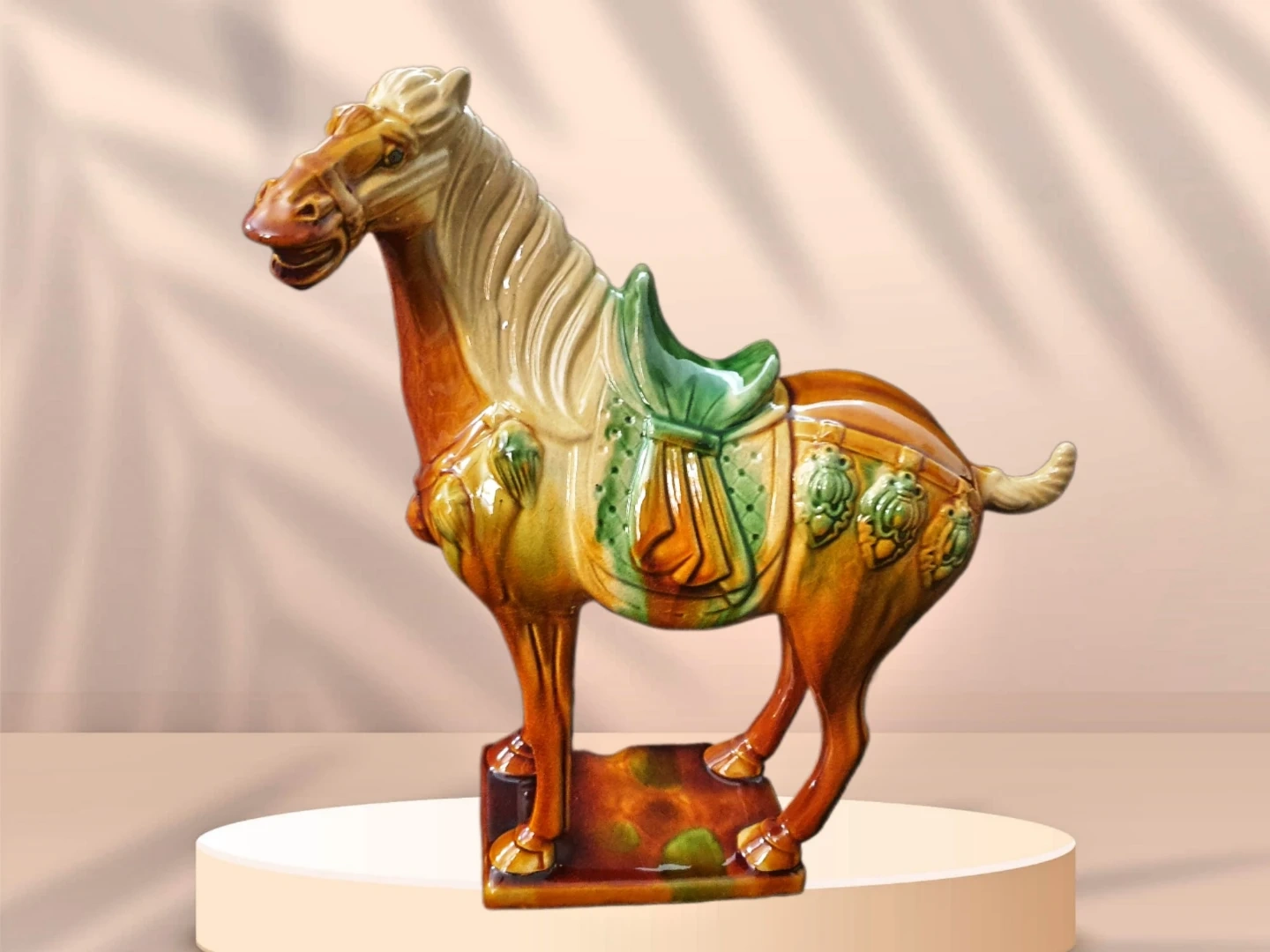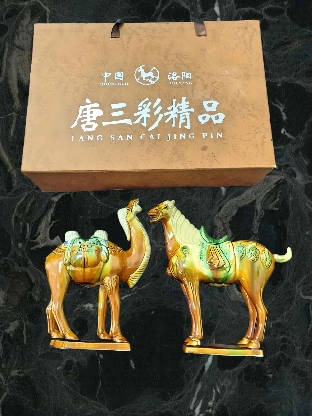 Vibrant amber, emerald-green, and creamy glazes catch the light beautifully on the proud prancing horse and majestic Bactrian camel β both bursting with authentic Luoyang detail, ornate saddles, and lifelike expressions.
