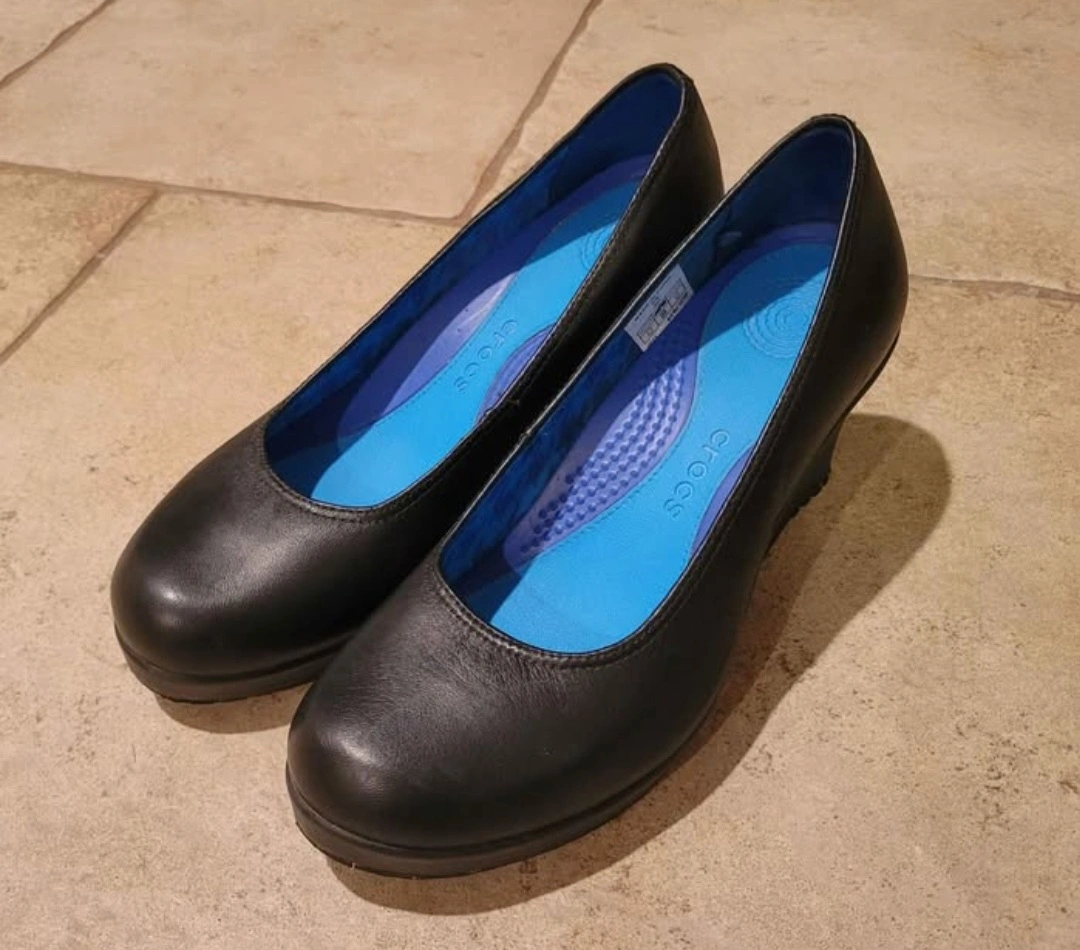 Pair of black Crocs, wedge heels. Comfortable and stylish footwear. Good for work or casual wear. pick up near Fanshawe and Highbury