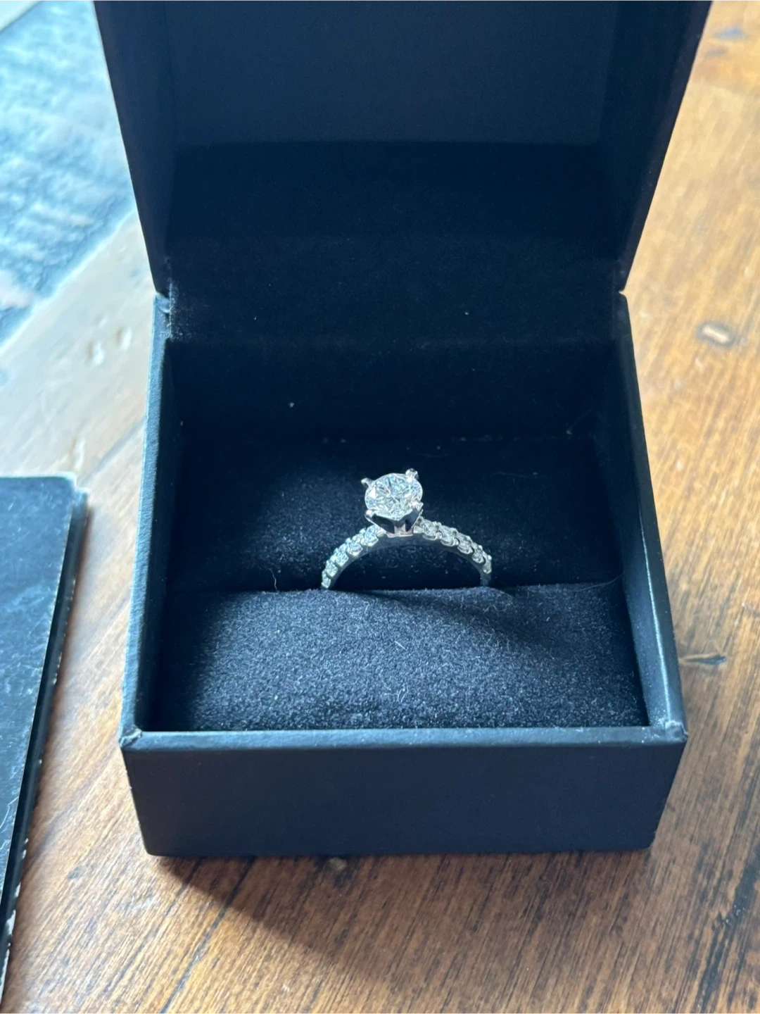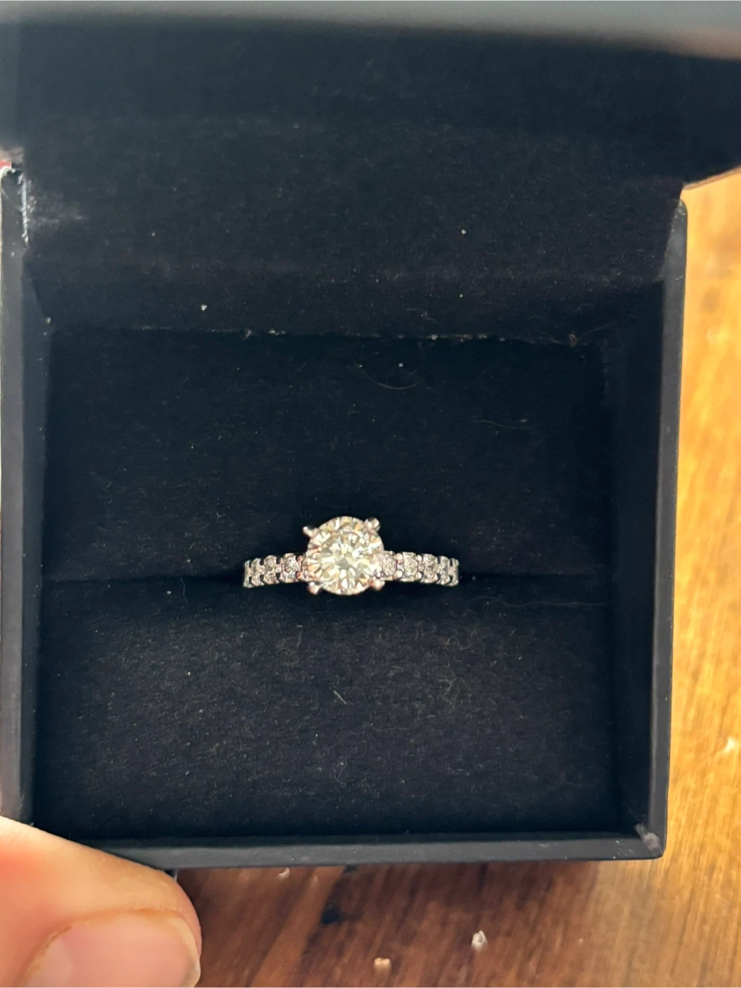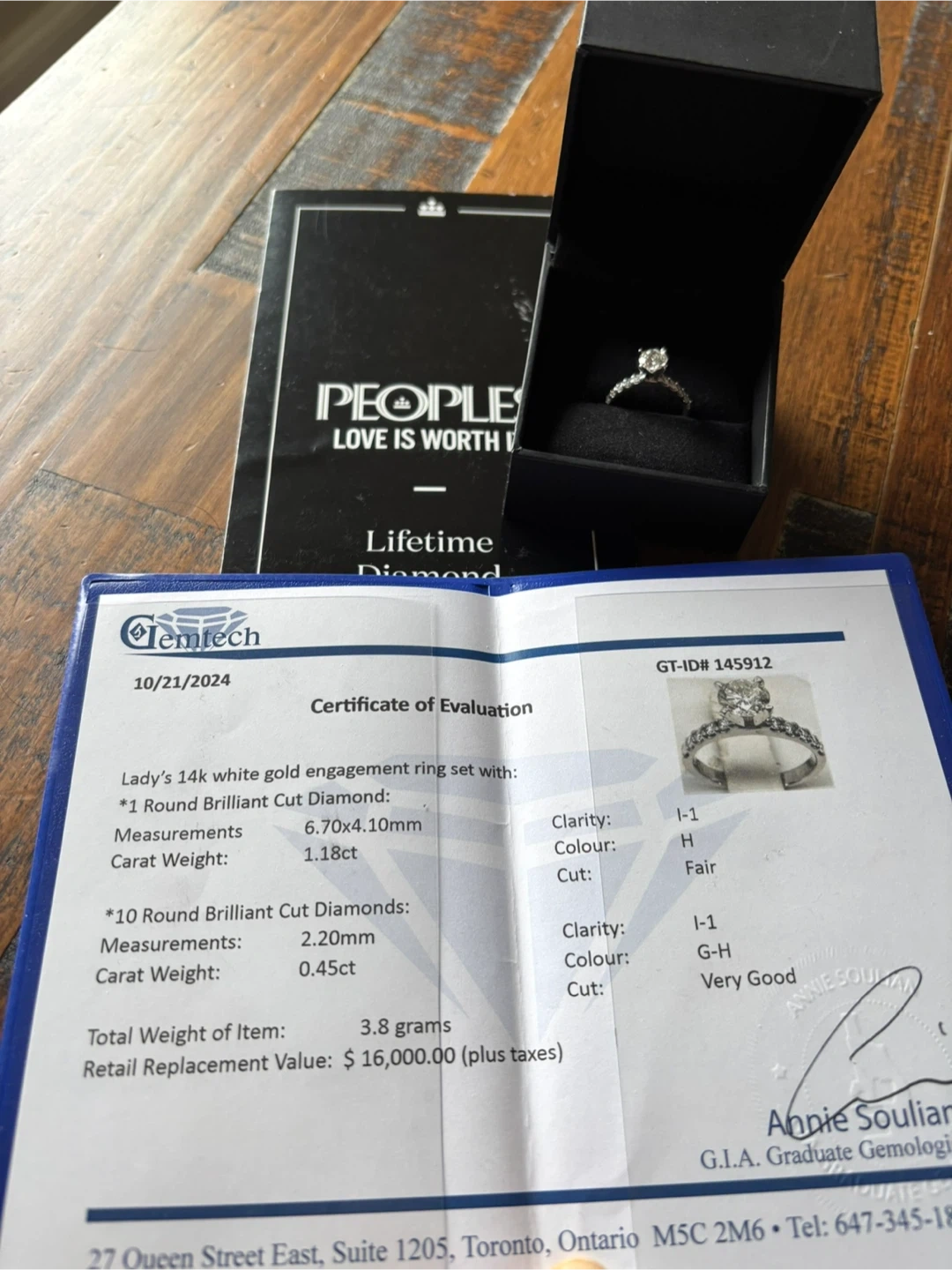 People’s Jewelry - 14k white gold engagement ring. Size 7.5. Centre round diamond 1.18ct AND 10 round brilliant diamonds total 0.45ct.