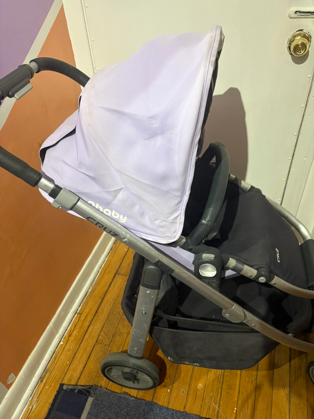 Lightweight stroller, easy to fold and manoeuvre. Features a five-point harness and adjustable canopy. Grey fabric with lavender accents. Used condition. Needs some clean otherwise good condition.
