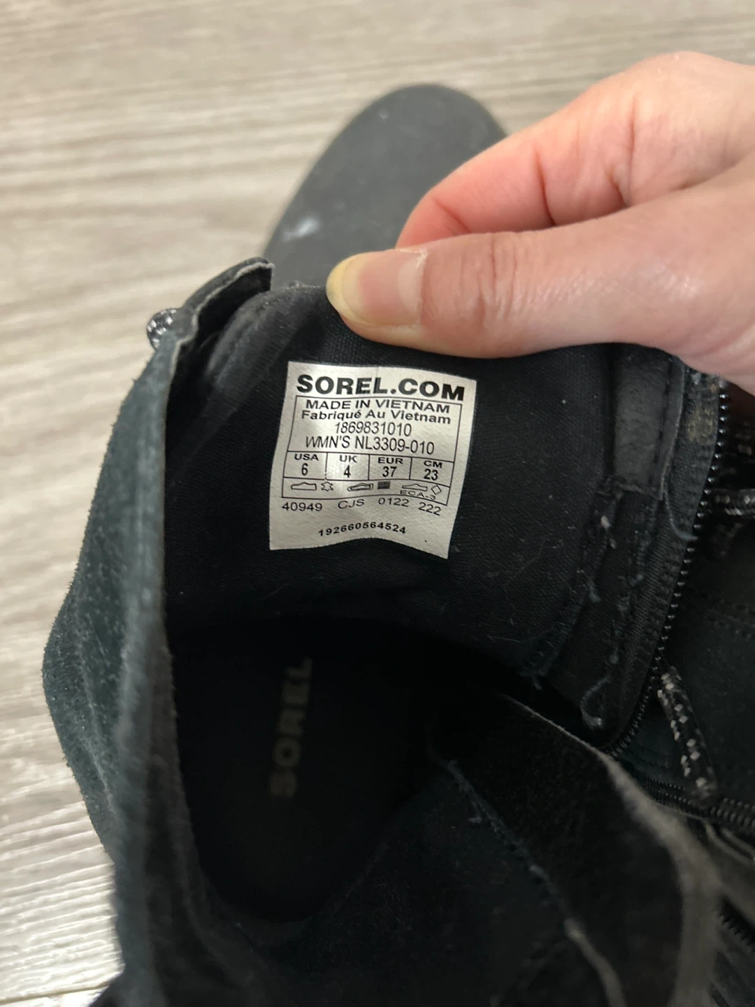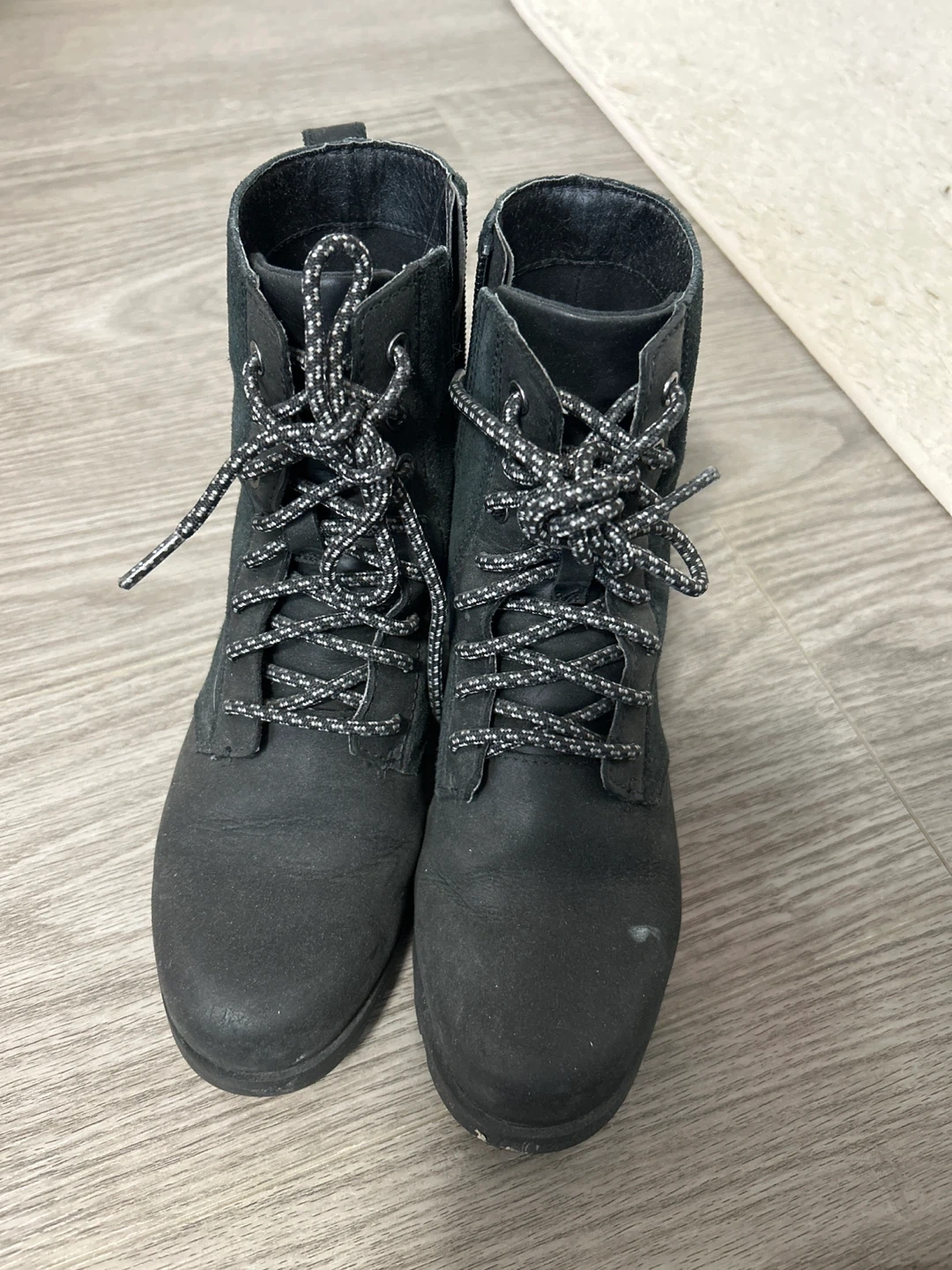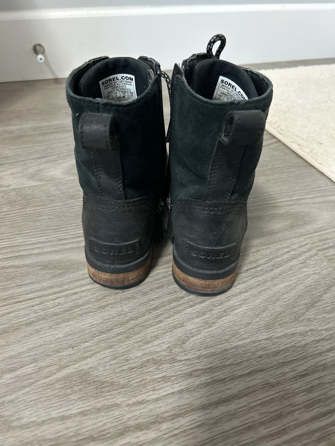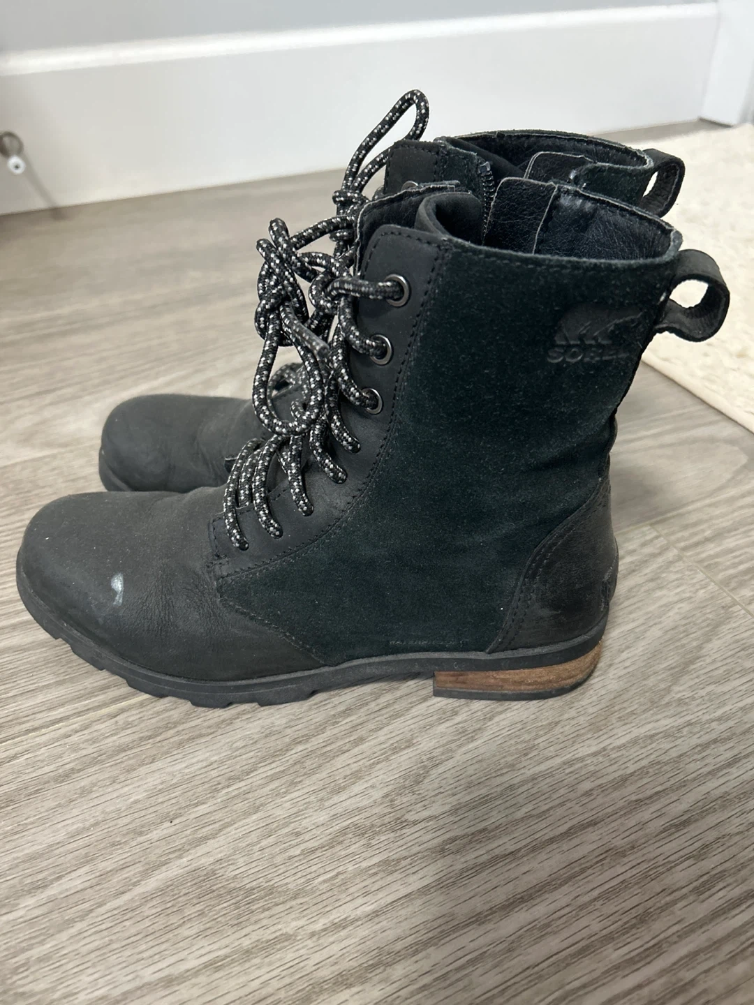 Selling a pair of Sorel women's boots, model NL3309-010 in size 6. They show some signs of wear, but still have plenty of life left! These boots feature a lace-up design with a side zipper for easy on and off.