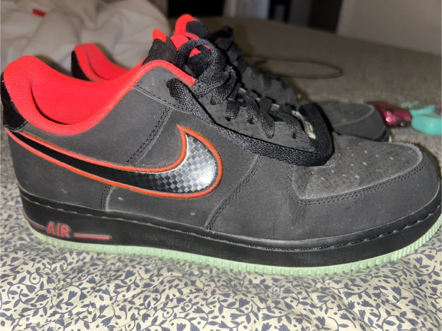 These are black Nike Air Force 1 sneakers with red accents. They feature a synthetic and carbon fiber material mix. The soles are light green rubber.