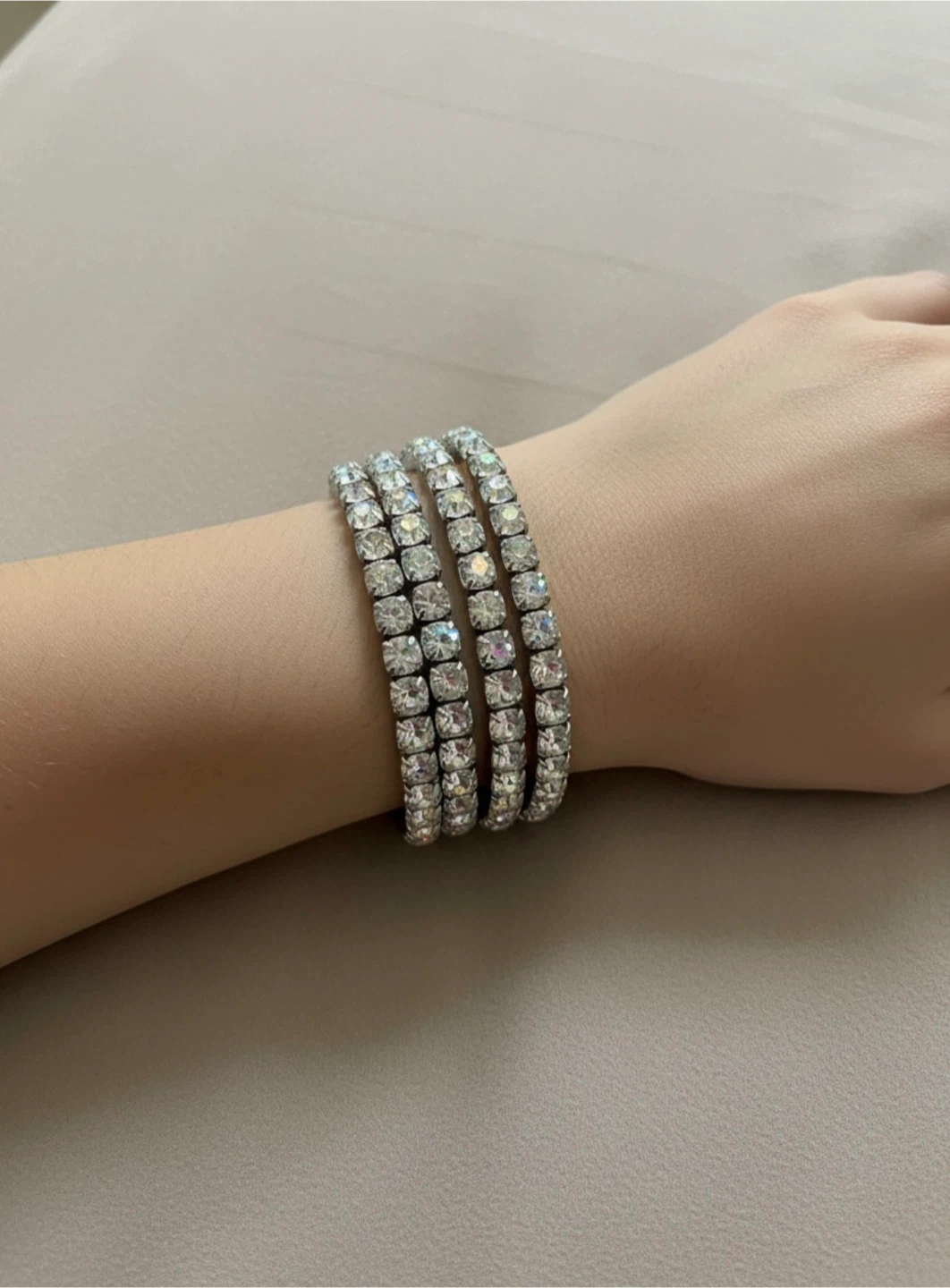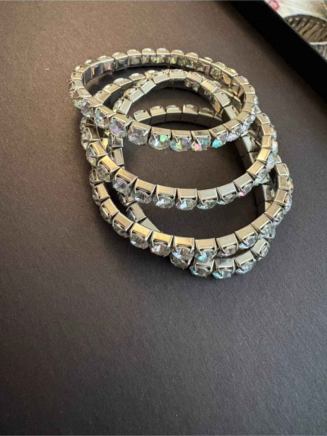 Vintage Set of sparkly stretchy bracelets with clear crystal-like stones. Each bracelet has a metal band with small square links between the stones. They measure approximately 5.5 cm across when not stretched. Perfect for adding a touch of shine to an outfit!