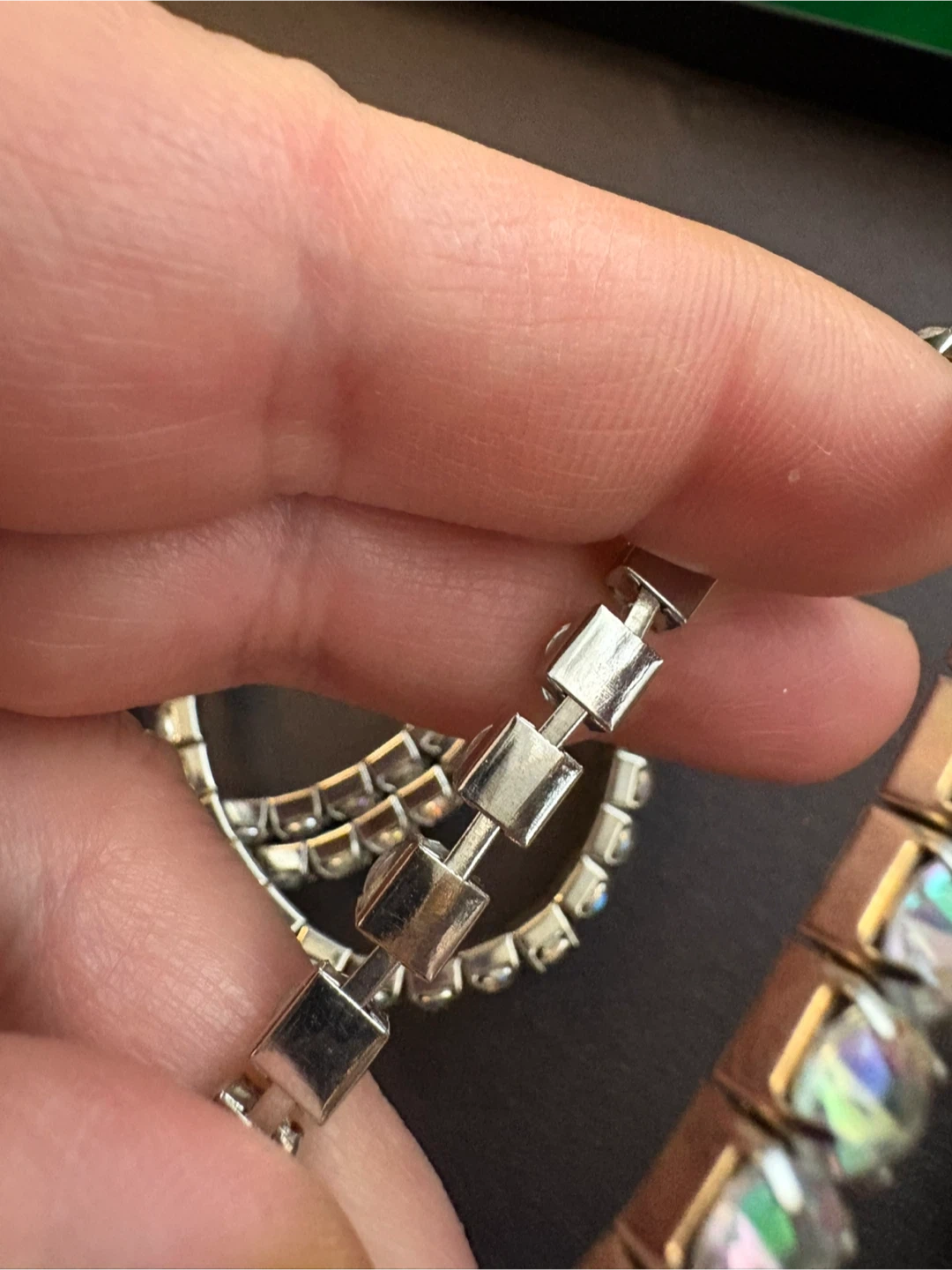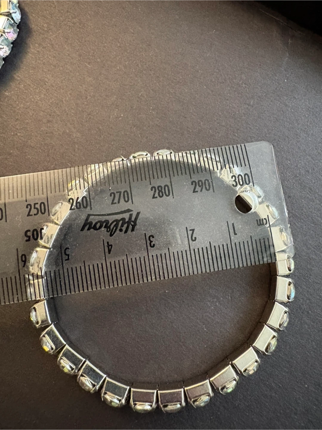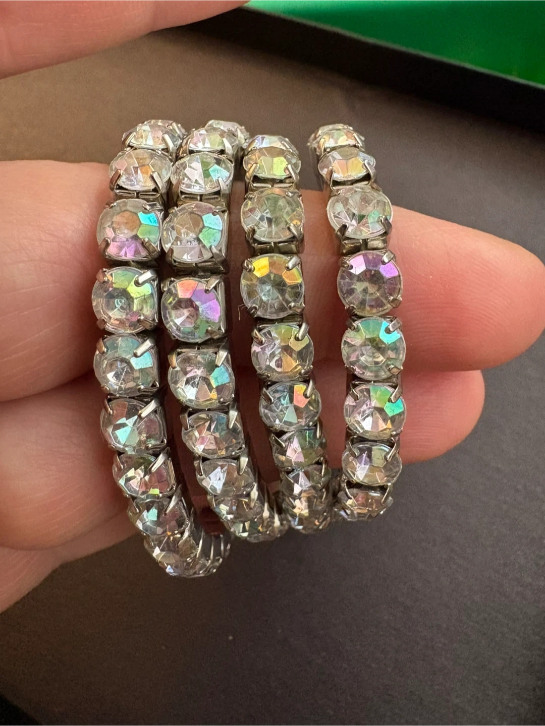 Vintage Set of sparkly stretchy bracelets with clear crystal-like stones. Each bracelet has a metal band with small square links between the stones. They measure approximately 5.5 cm across when not stretched. Perfect for adding a touch of shine to an outfit!