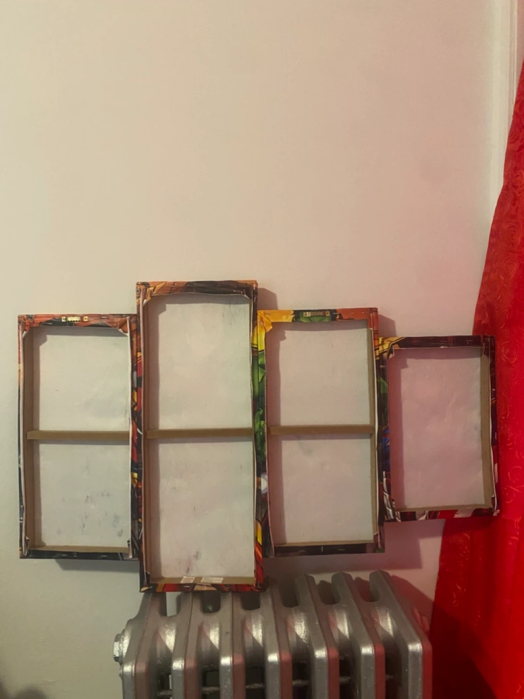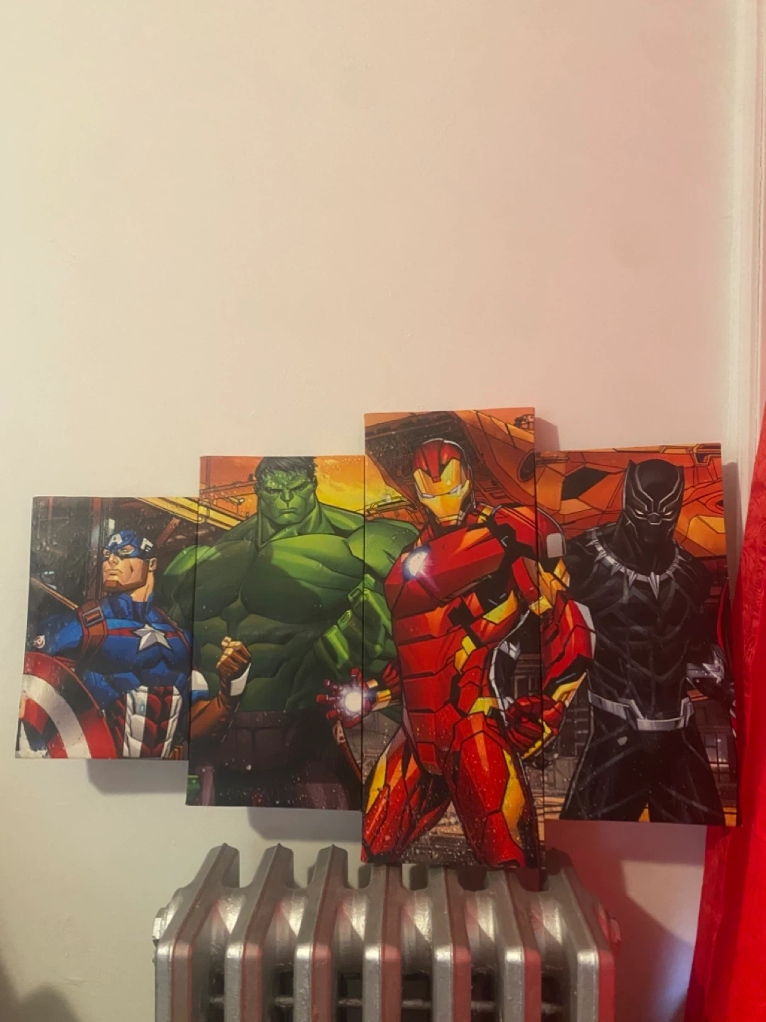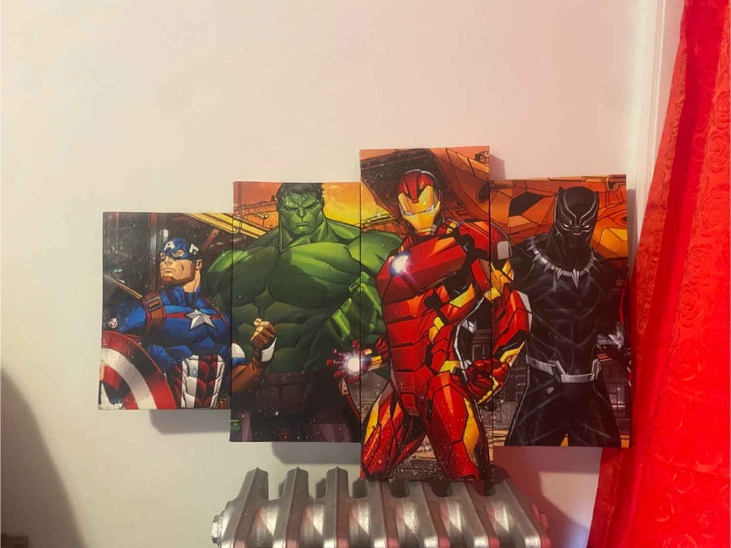 This multi-panel canvas art features Captain America, Hulk, Iron Man, and Black Panther. It's a vibrant piece for any fan's room. The canvas is stretched over wooden frames.