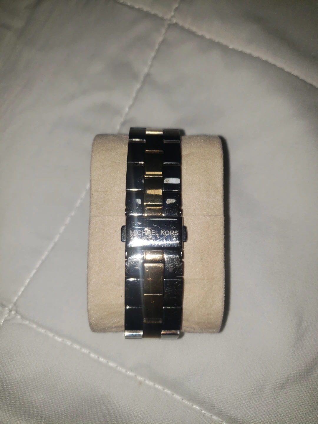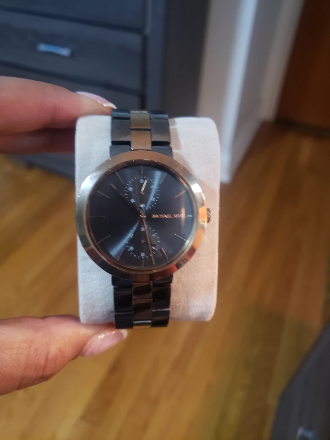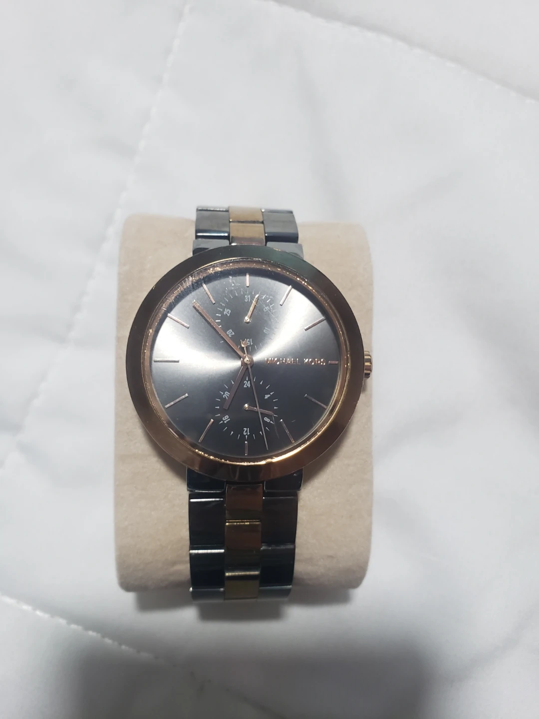 Michael Kors watch with a two-tone stainless steel band in gunmetal and gold. Features a dark gray multi-dial face. Adds a stylish touch to any outfit!
