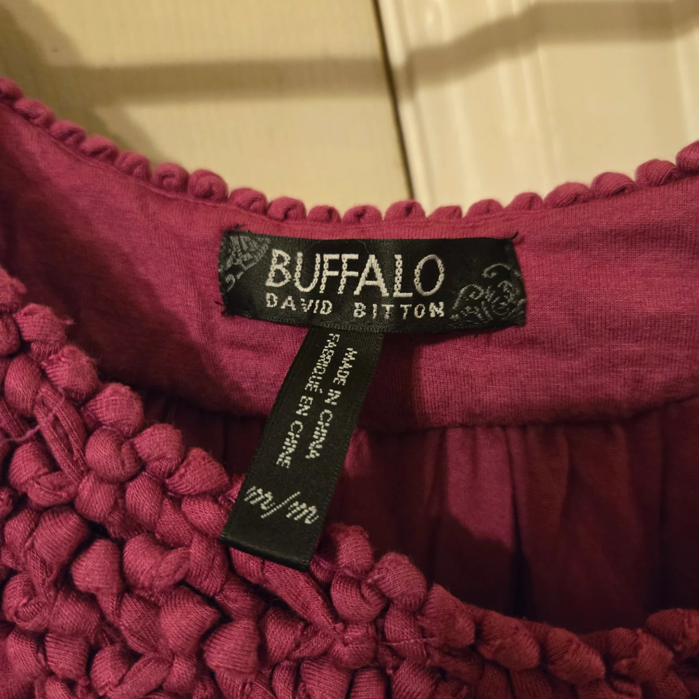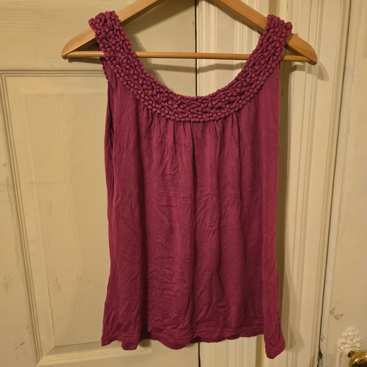 This is a magenta Buffalo David Bitton tank top with a unique braided neckline detail. It's made from 95% rayon and 5% spandex.