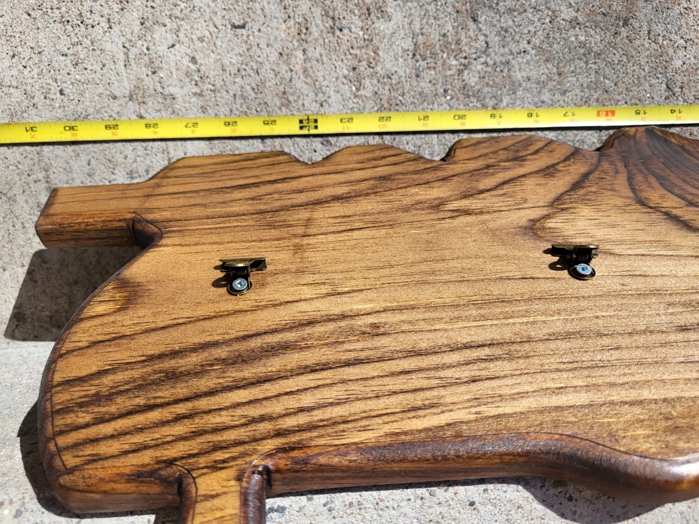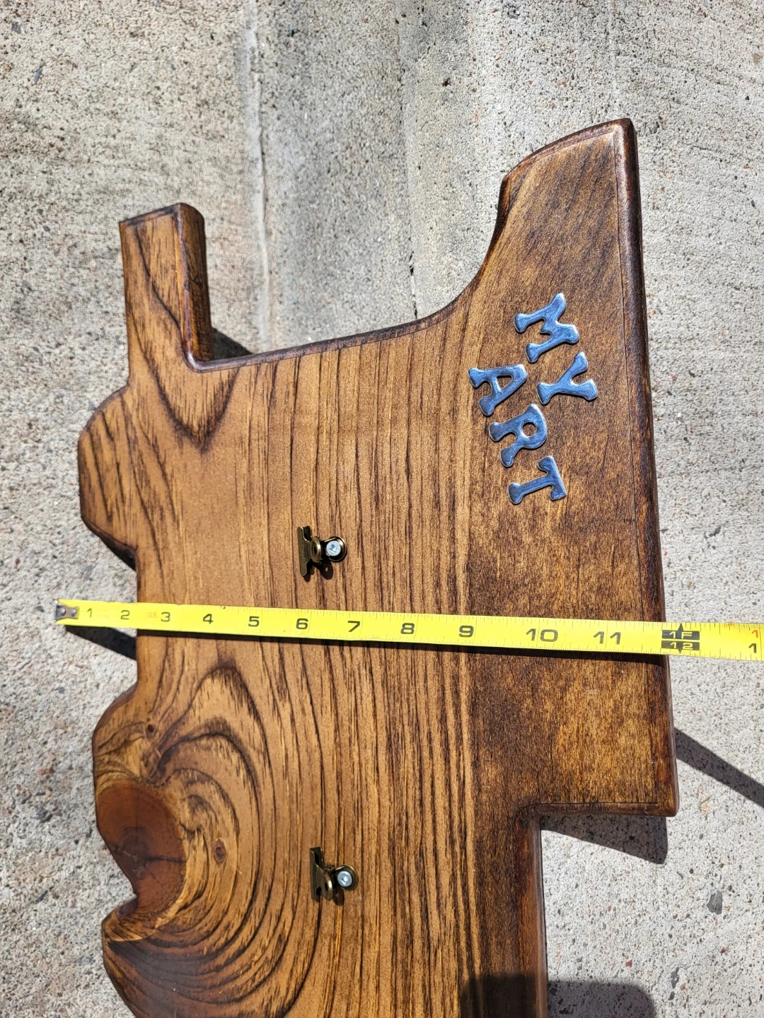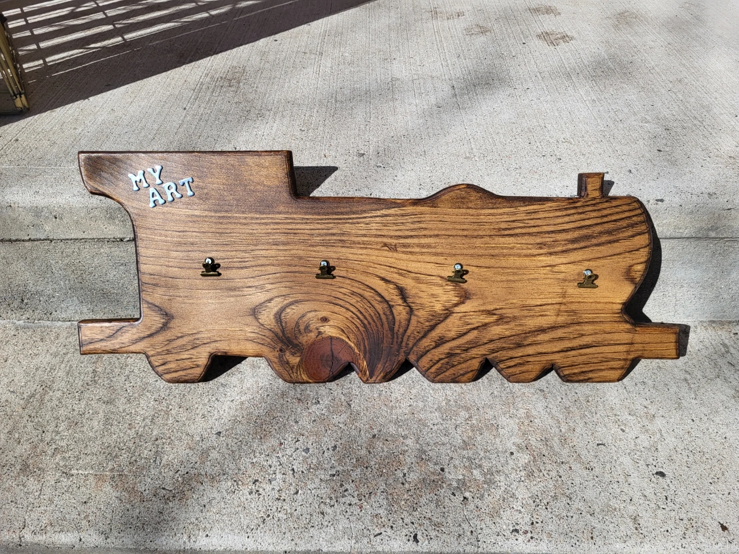 Wooden display board shaped like a train. It's designed to showcase children's artwork with small metal clips. The wood has a rich stain and the letters "MY ART" are attached. This piece would be great for a kid's room or a play area!