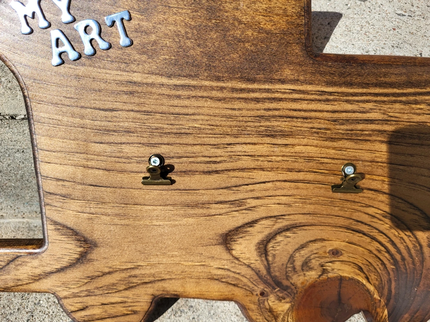 Wooden display board shaped like a train. It's designed to showcase children's artwork with small metal clips. The wood has a rich stain and the letters "MY ART" are attached. This piece would be great for a kid's room or a play area!