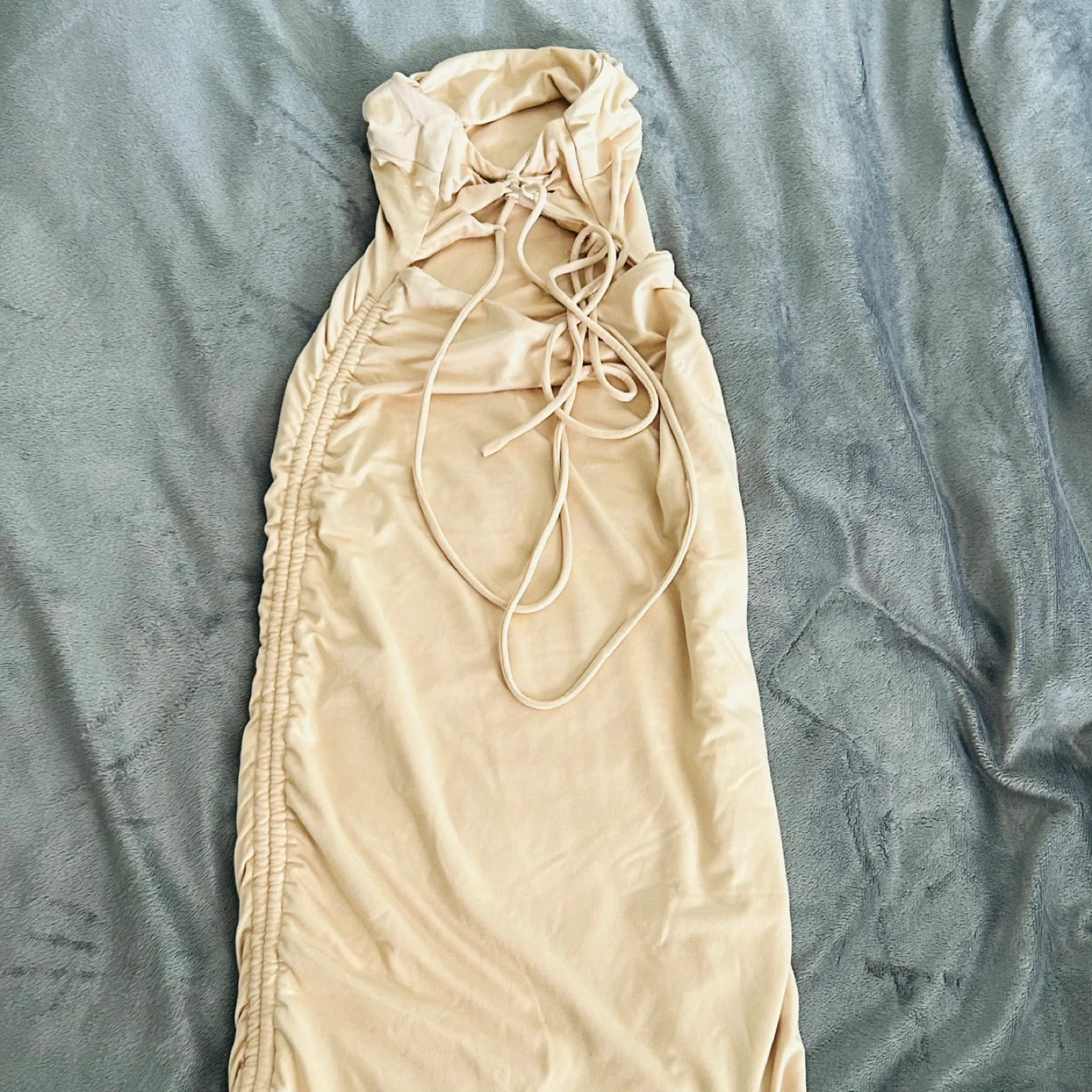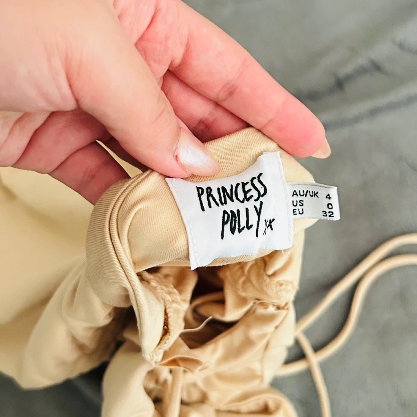 Selling a cute Princess Polly mini dress in a size 0. It's a beautiful neutral colour with a ruched design and adjustable drawstrings on the side. Perfect for a night out or a special occasion!