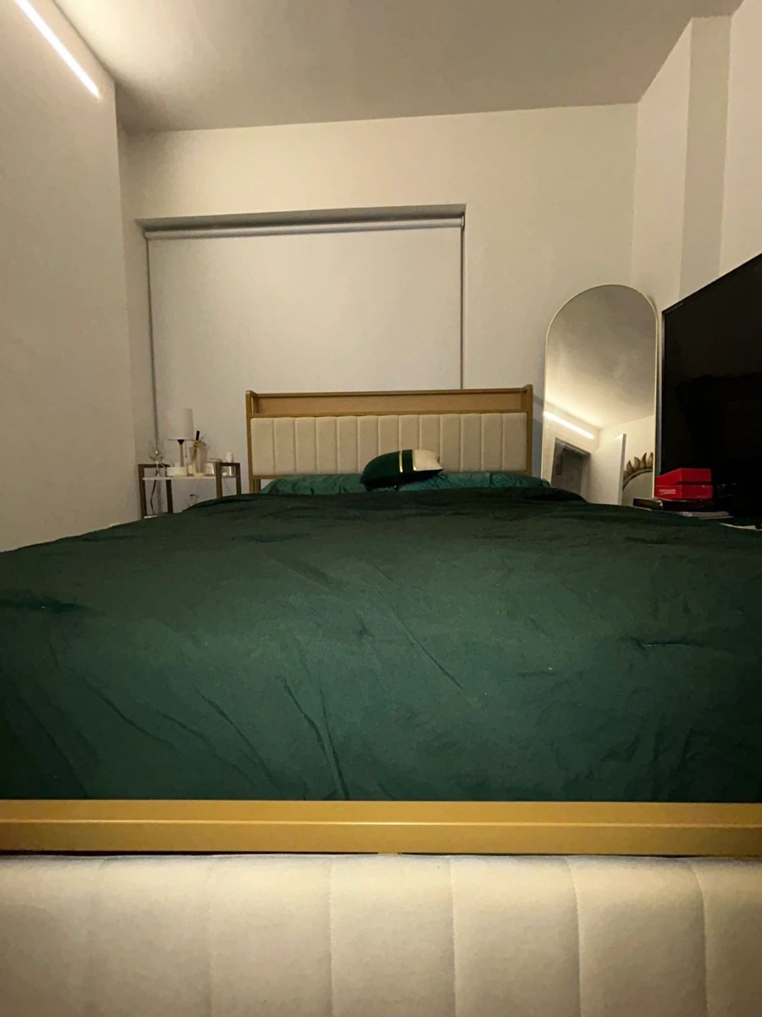 This bed frame features a cream upholstered headboard with integrated shelving and charging ports. Its sturdy gold metal frame offers modern style. It's a platform bed, so no box spring is needed. This bed is great for smaller rooms or anyone who likes to keep essentials nearby.