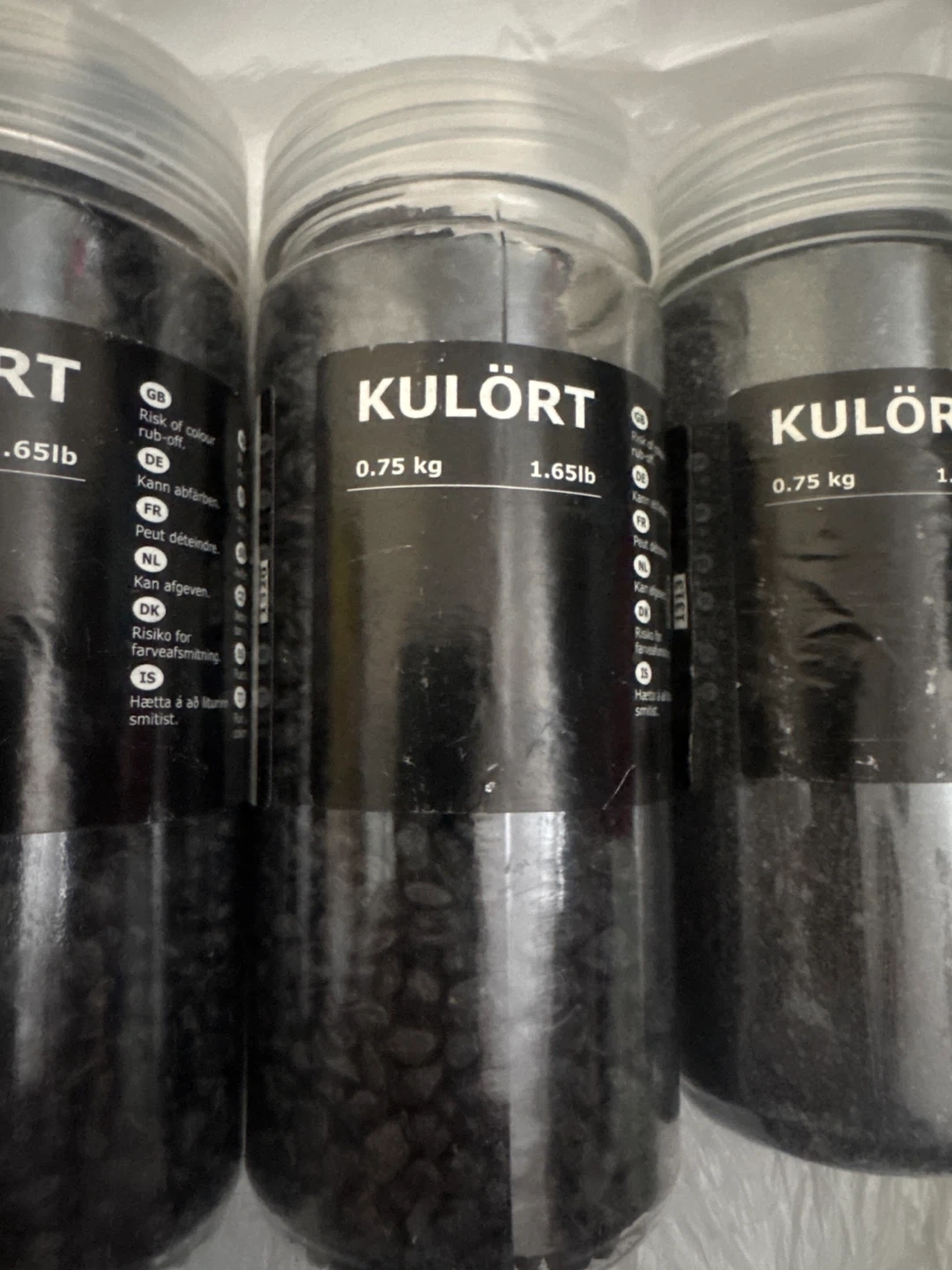 These are IKEA KULÖRT charcoal pellets. Each jar contains 0.75 kg (1.65lb) of product. The product has a risk of colour rub-off.