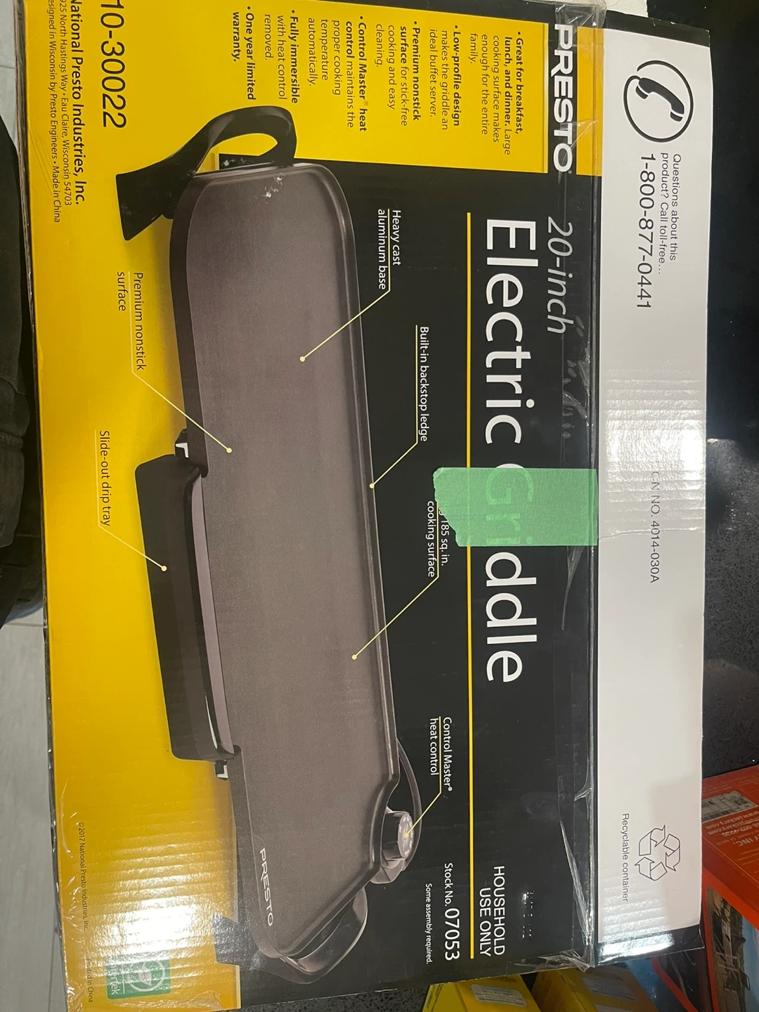 This Presto electric griddle is 20 inches long and features a premium nonstick surface for easy cooking and cleanup. It includes a slide-out drip tray and a Control Master heat control for automatic temperature maintenance. Perfect for cooking breakfast for the entire family!