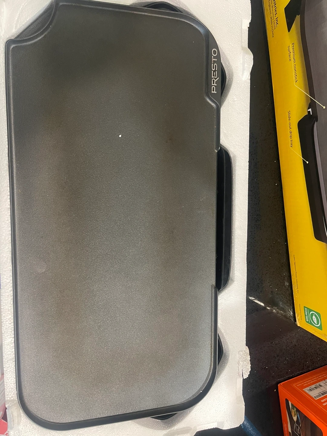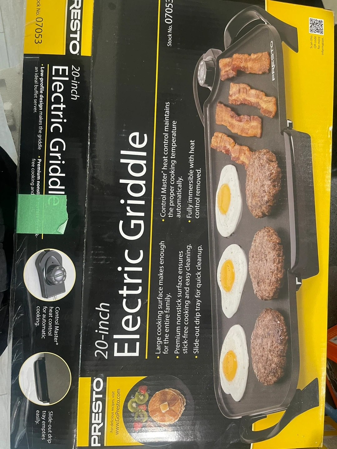 This Presto electric griddle is 20 inches long and features a premium nonstick surface for easy cooking and cleanup. It includes a slide-out drip tray and a Control Master heat control for automatic temperature maintenance. Perfect for cooking breakfast for the entire family!