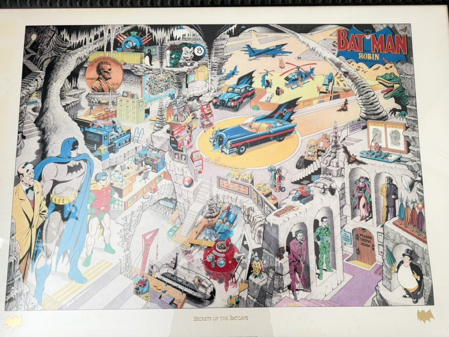 Selling a framed print of "Batman and Robin: Secrets of the Batcave"! It's a detailed illustration showing all the gadgets, vehicles, and characters within the Batcave. A cool piece for any Batman fan!