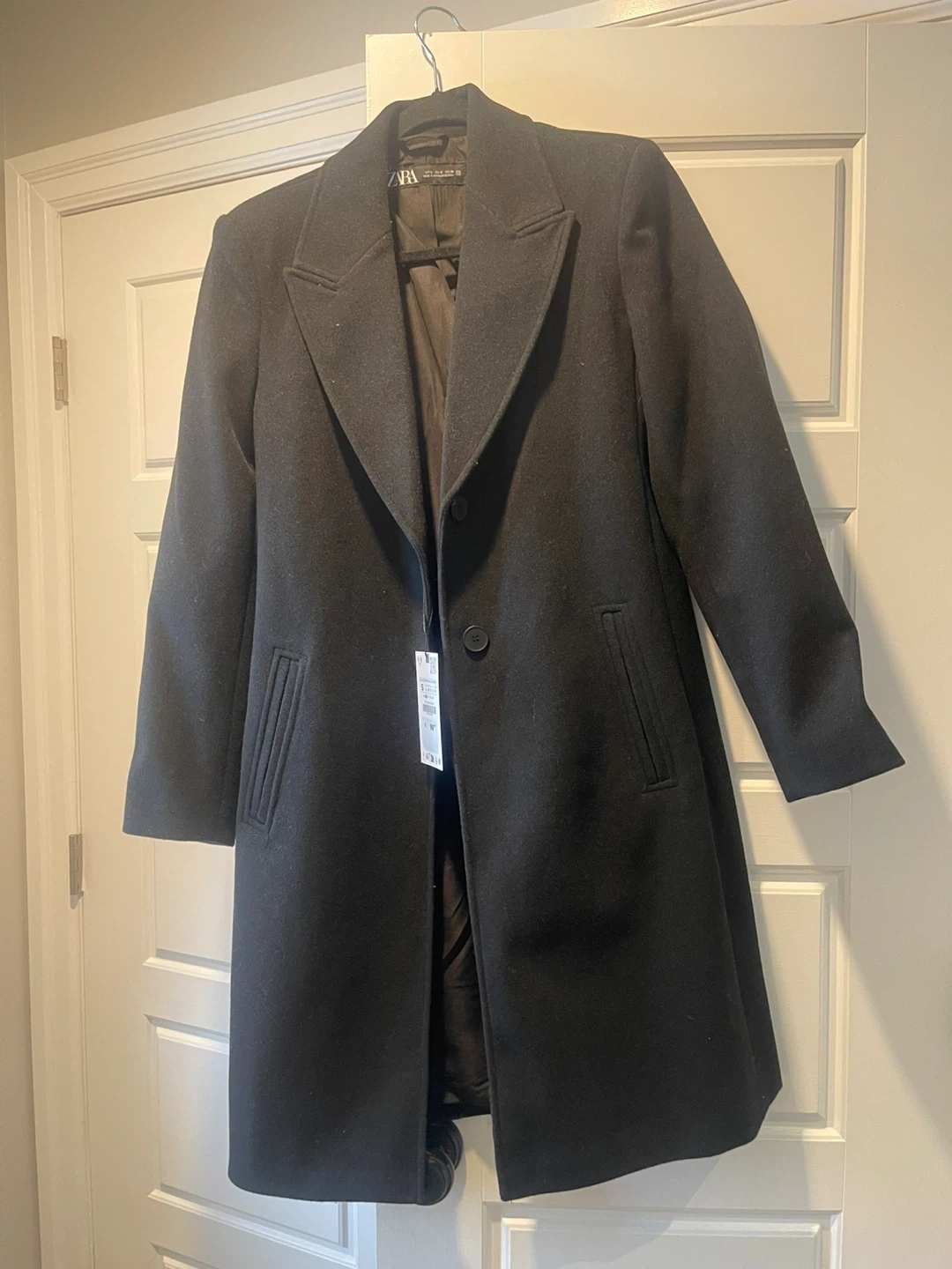 Selling a Zara wool blend coat in black. It's a size S (EUR S / USA S / MEX 26). This coat is in great condition and ready for a new home! Perfect for keeping warm this winter season
