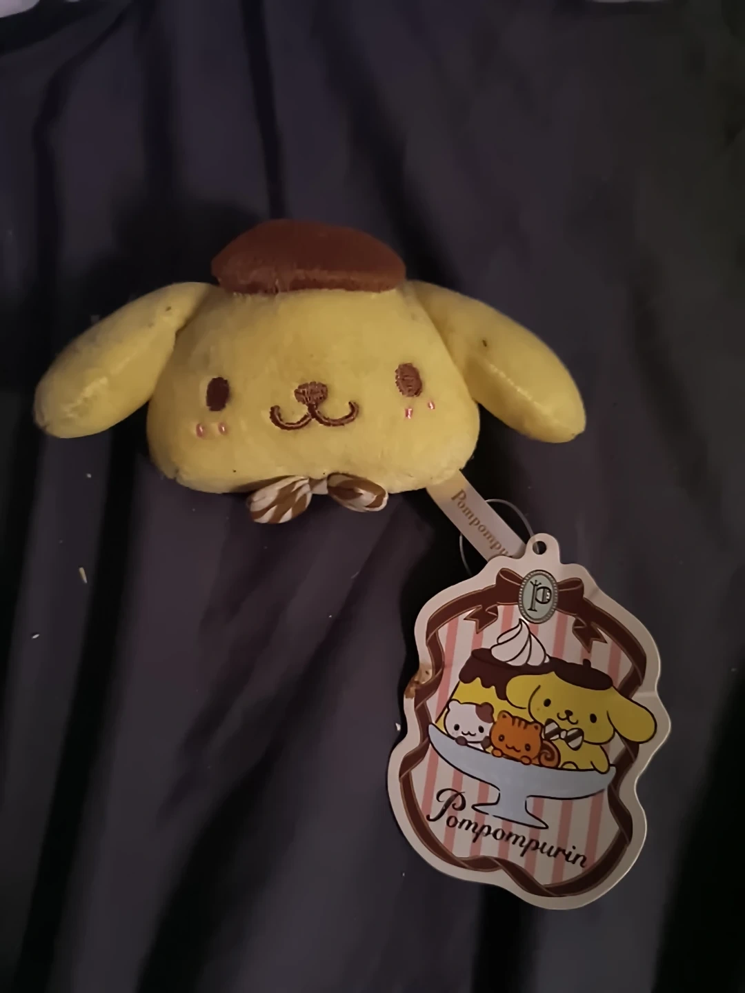 This is a cute, yellow Pompompurin plush toy with a brown hat & a striped bowtie. It's soft and huggable, perfect for Sanrio fans. Makes a delightful gift for anyone who loves cute collectibles!