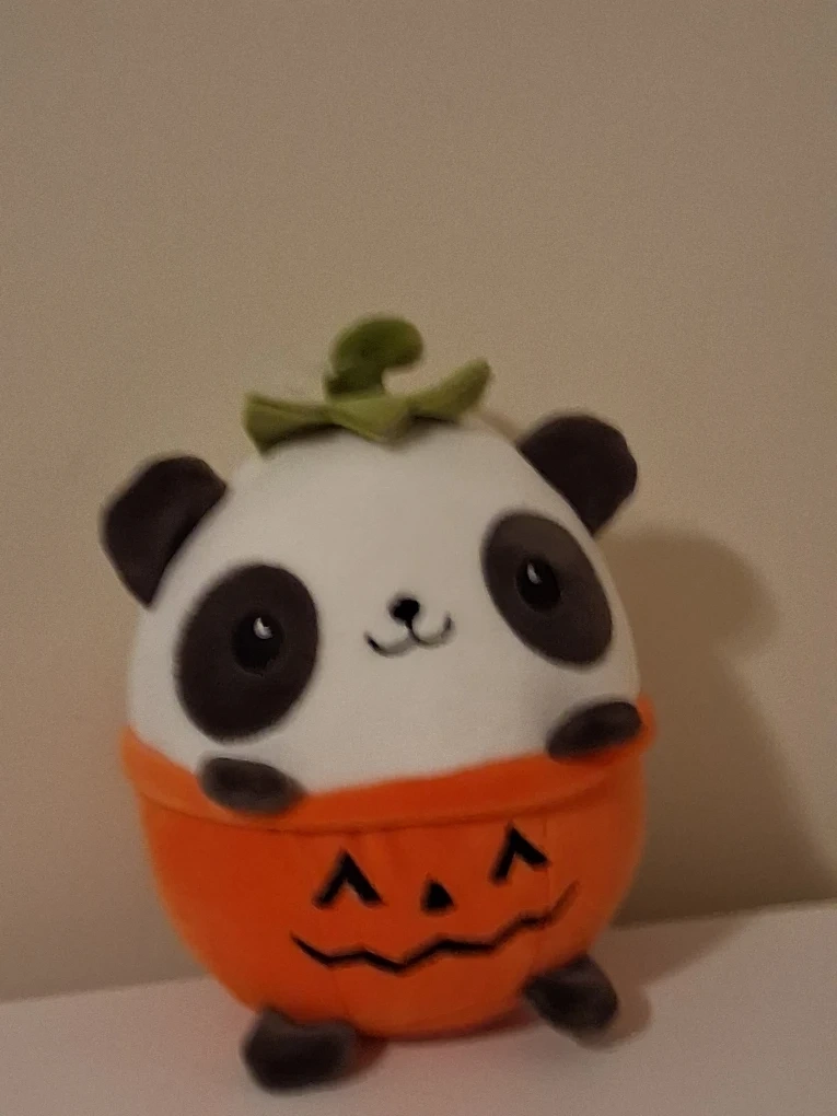 Selling a cute panda plush toy dressed as a pumpkin! It's in great condition and perfect for Halloween or just as a cuddly friend