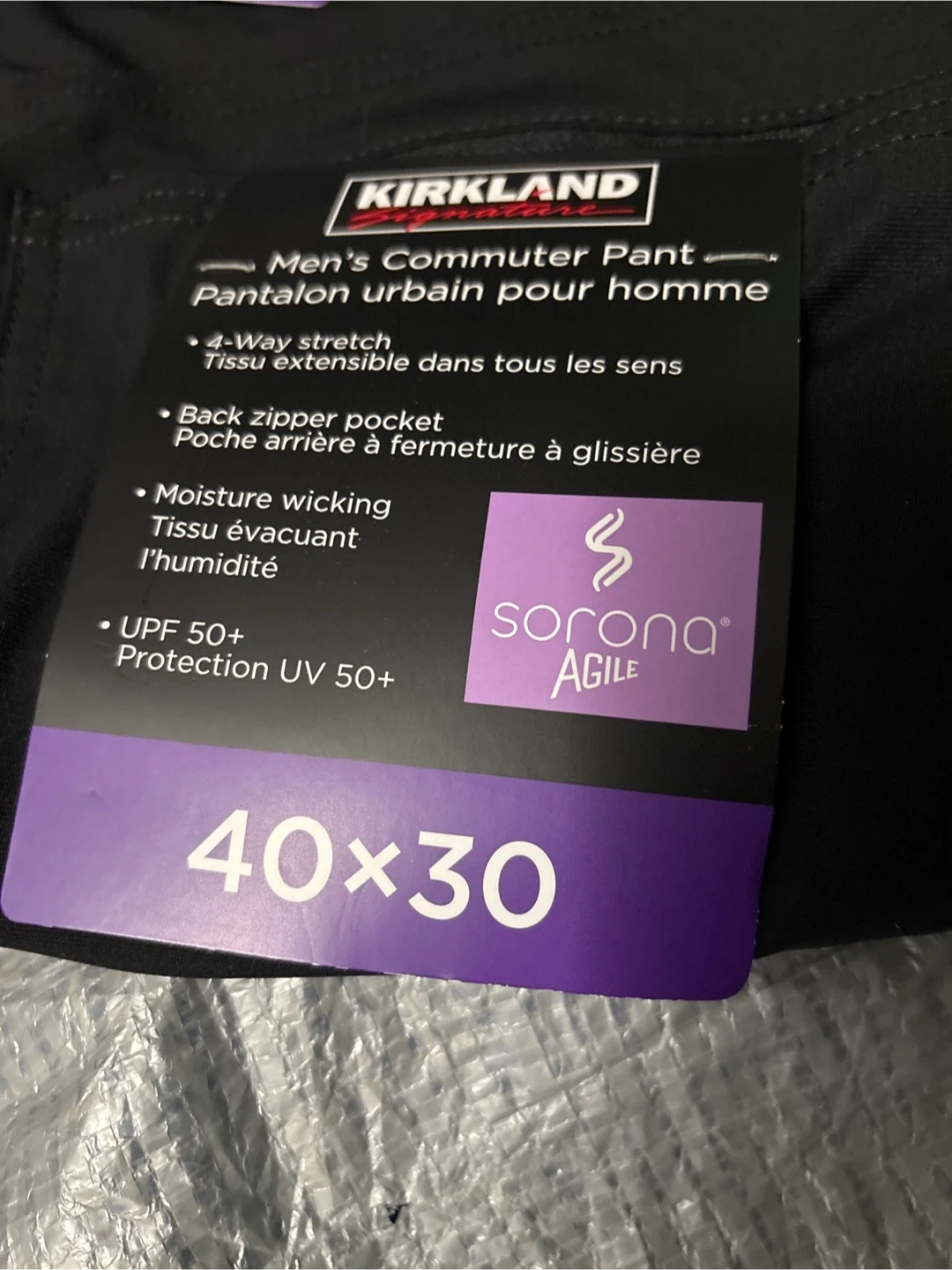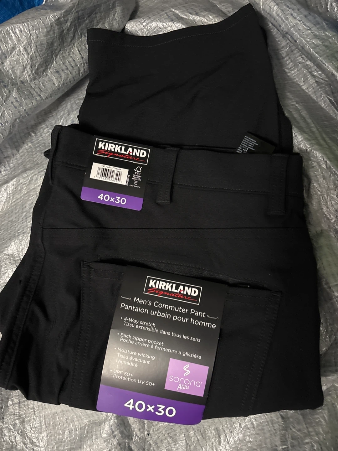 Selling a pair of Kirkland Signature Men's Commuter Pants in size 40x30. These pants feature 4-way stretch, a back zipper pocket, and moisture-wicking fabric. They also offer UPF 50+ sun protection. Great for everyday wear!