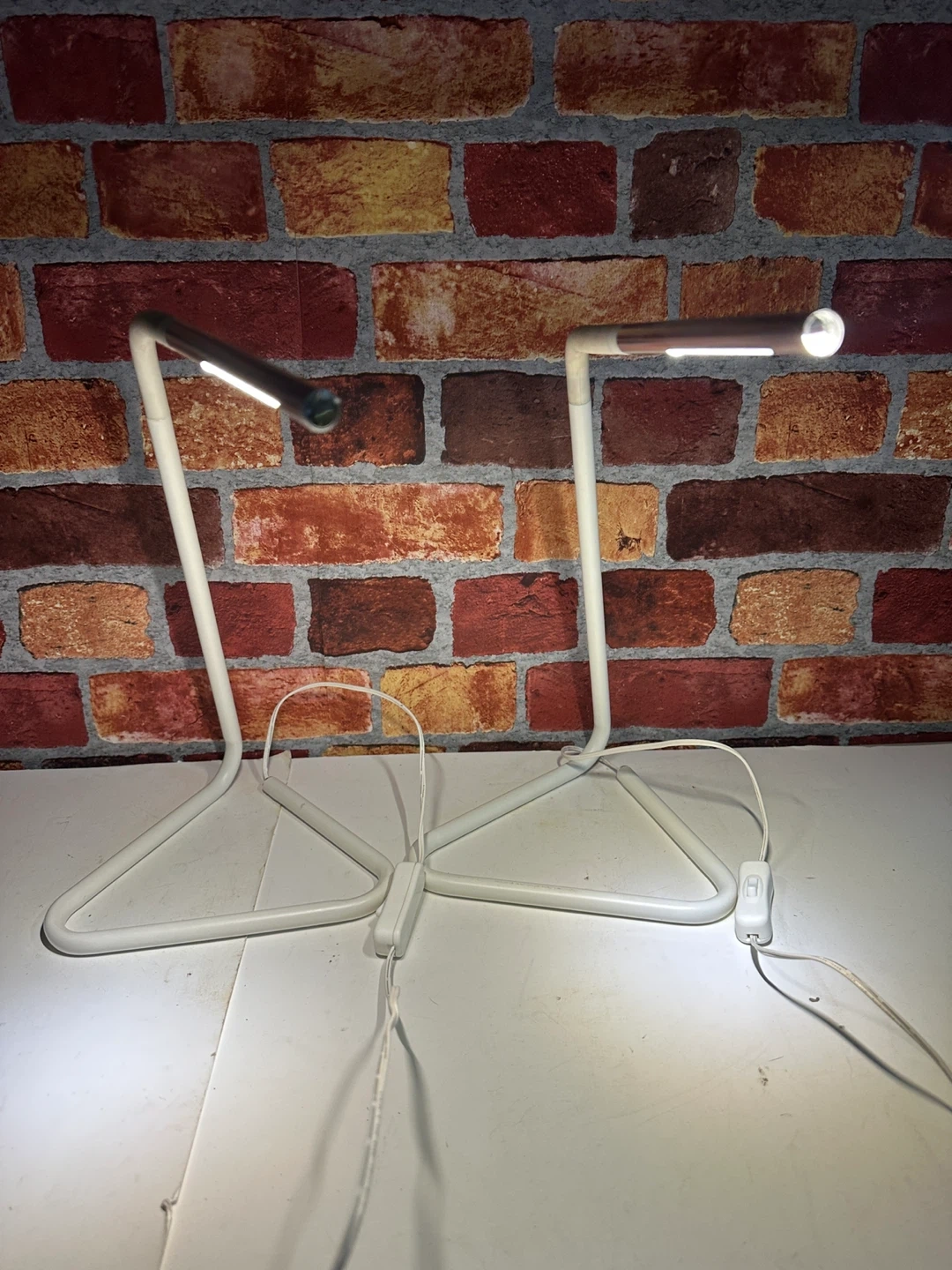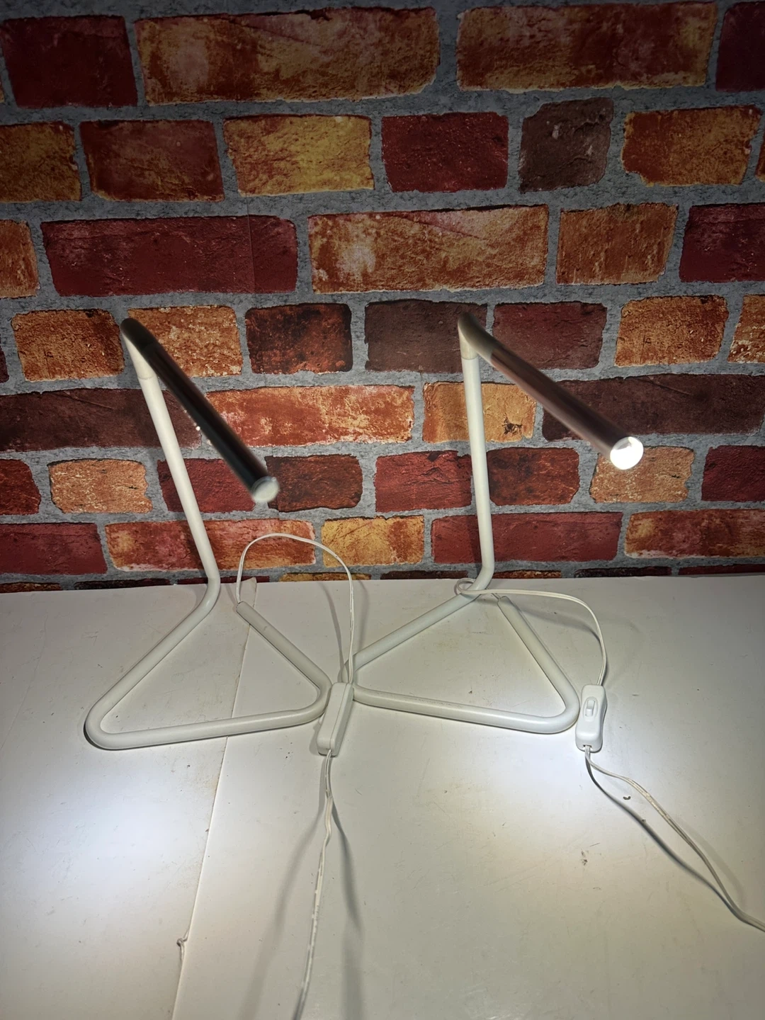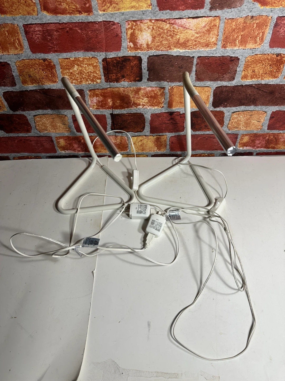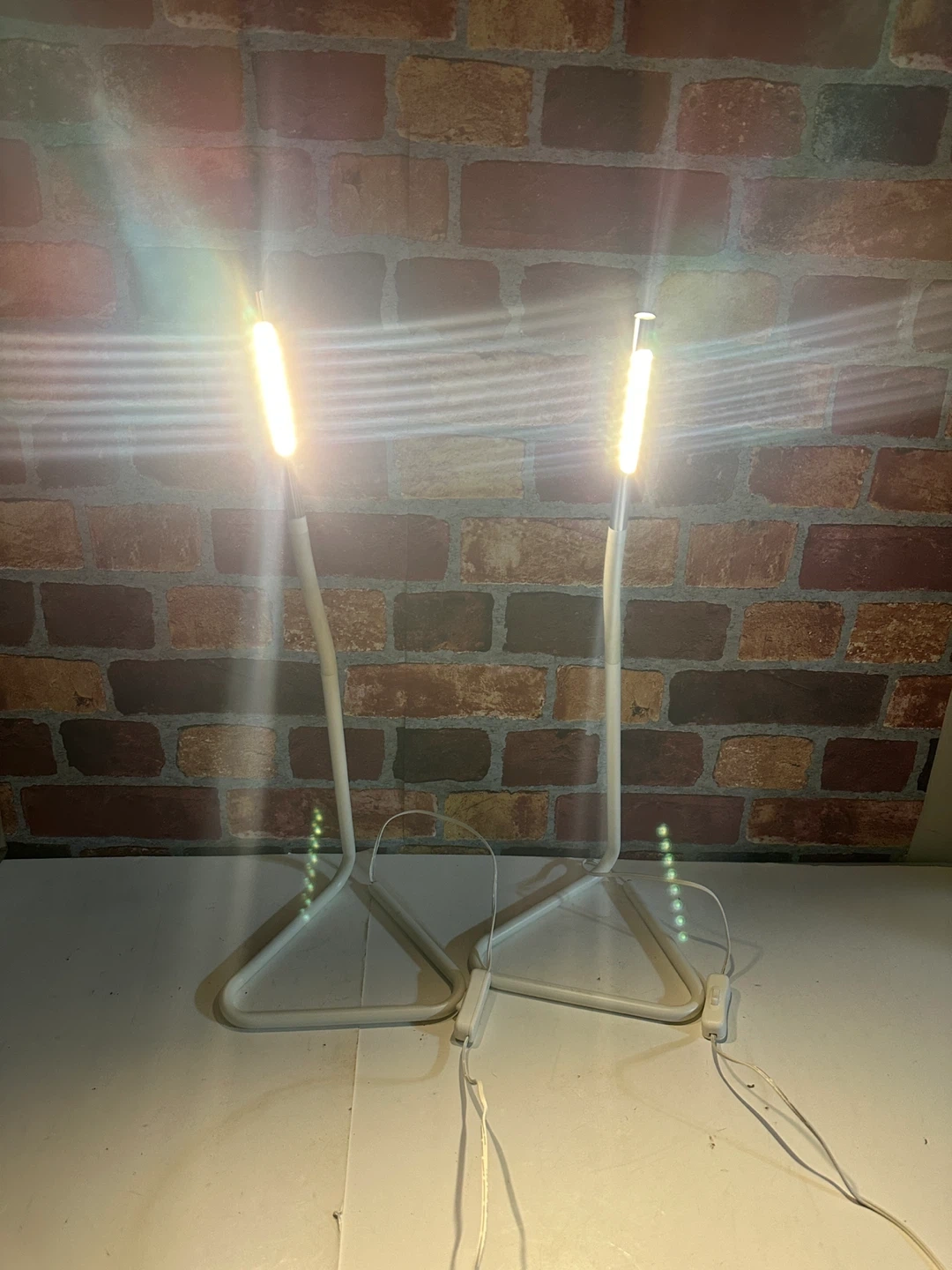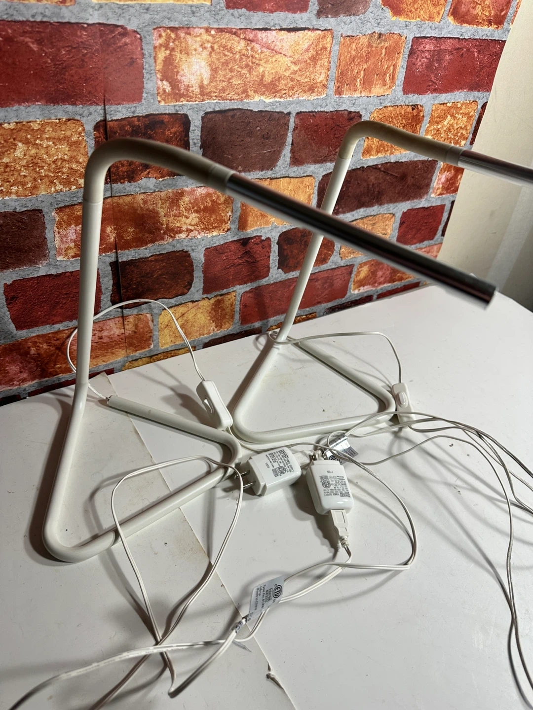 Two white IKEA table lamps with silver accents are included. Each lamp has a white cord with an inline switch and comes with its own white power adapter. This set is great for providing task lighting on desks or side tables.