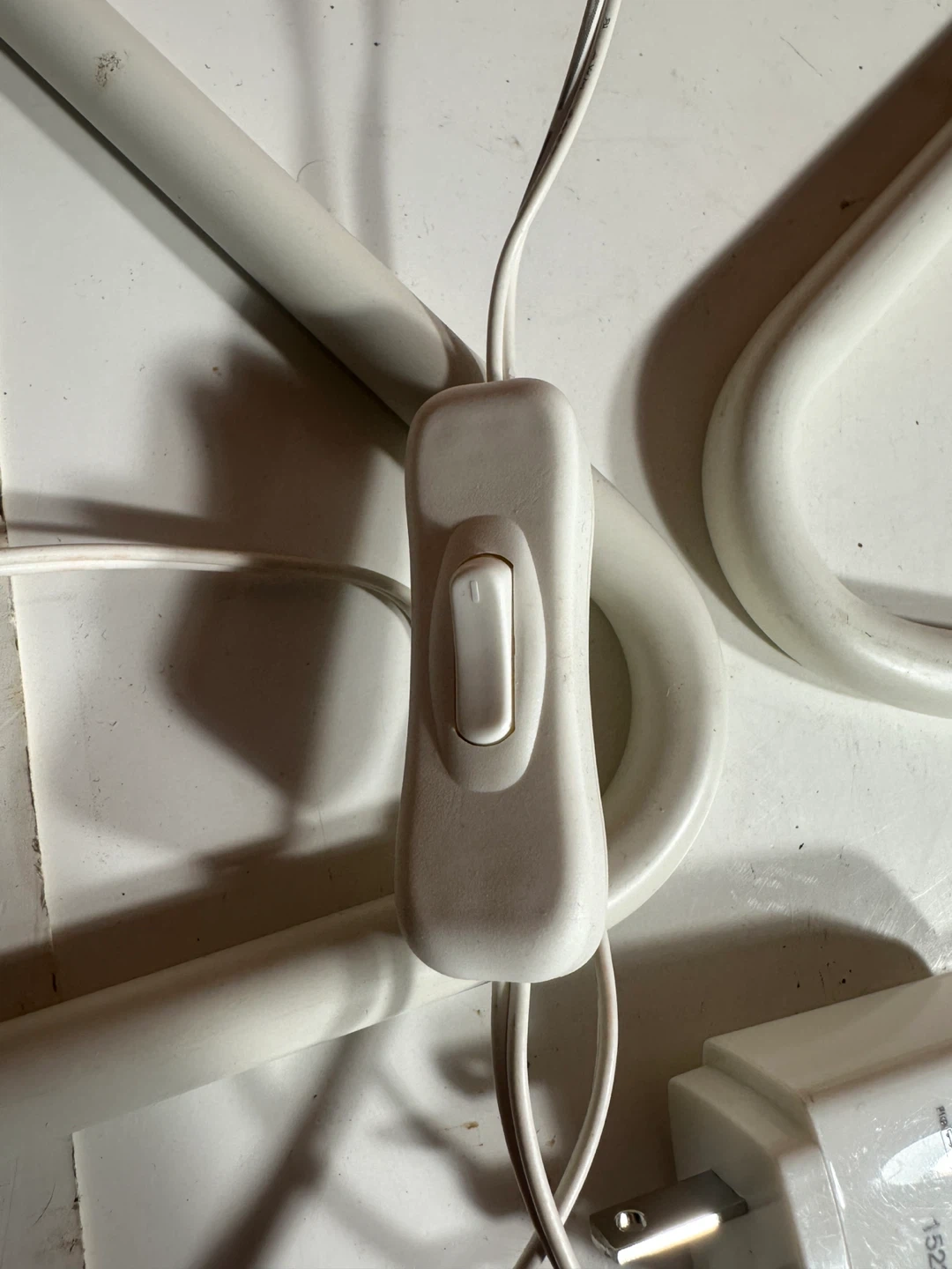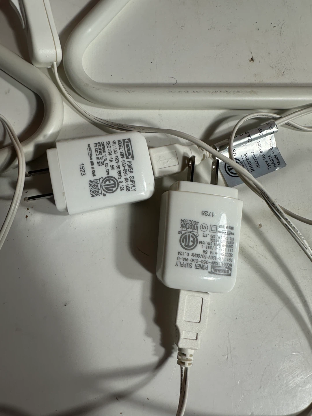 Two white IKEA table lamps with silver accents are included. Each lamp has a white cord with an inline switch and comes with its own white power adapter. This set is great for providing task lighting on desks or side tables.