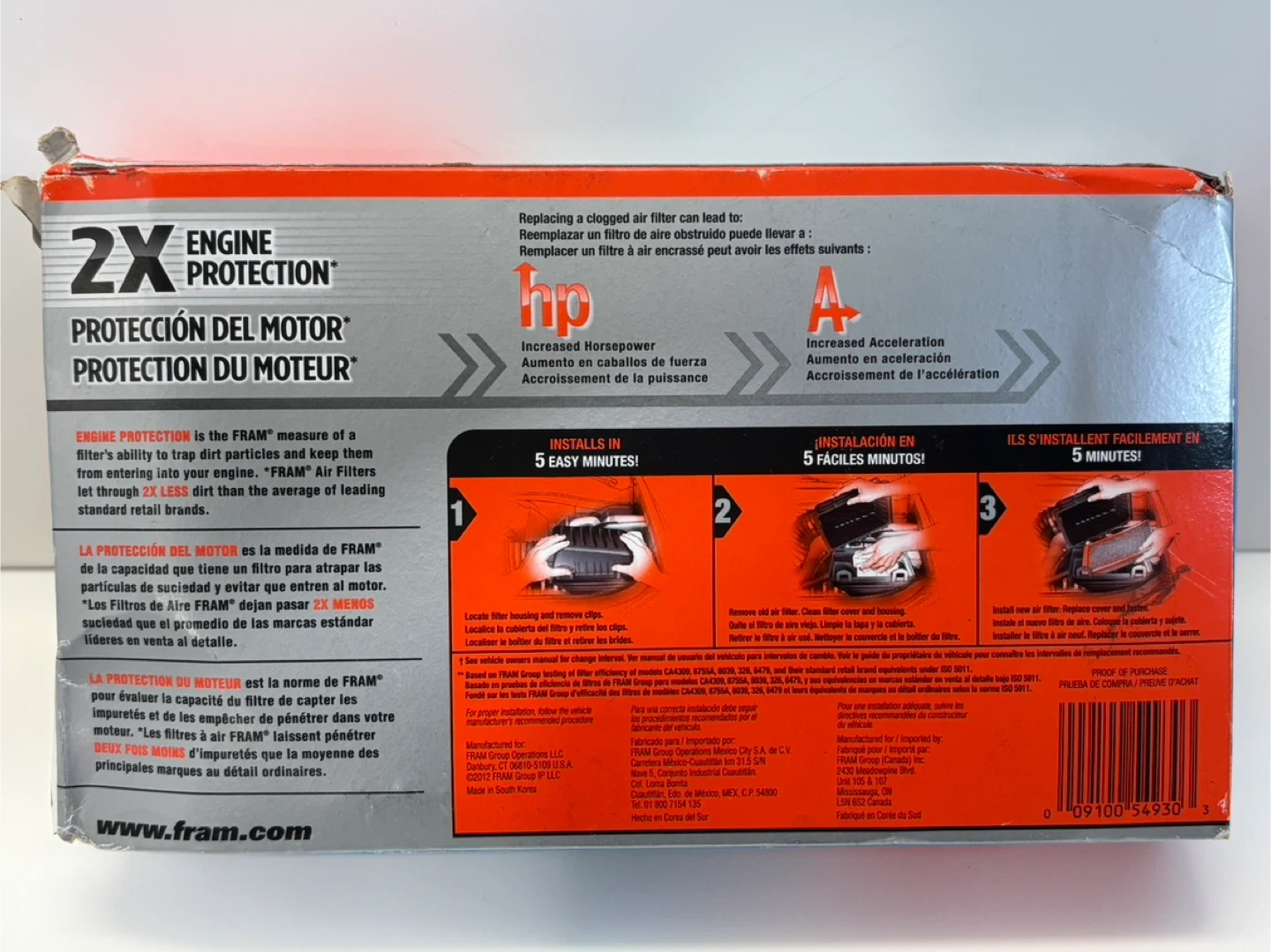 FRAM Extra Guard air filter, model CA11206. It offers 2X engine protection and installs in 5 minutes. This filter is designed for enhanced horsepower and acceleration. One piece included.