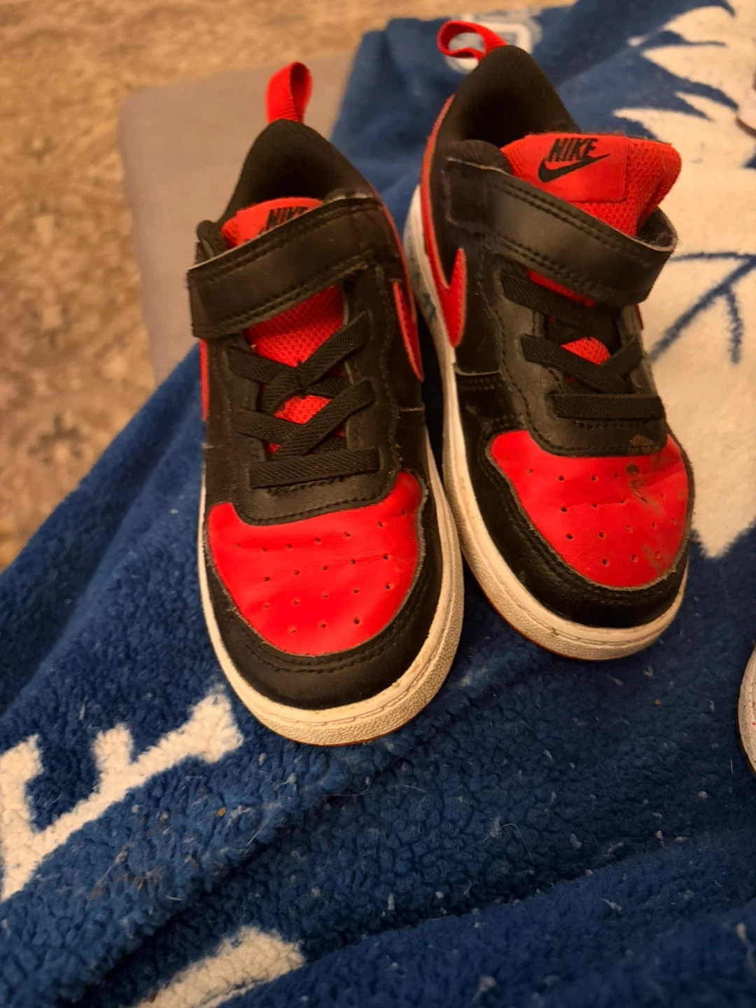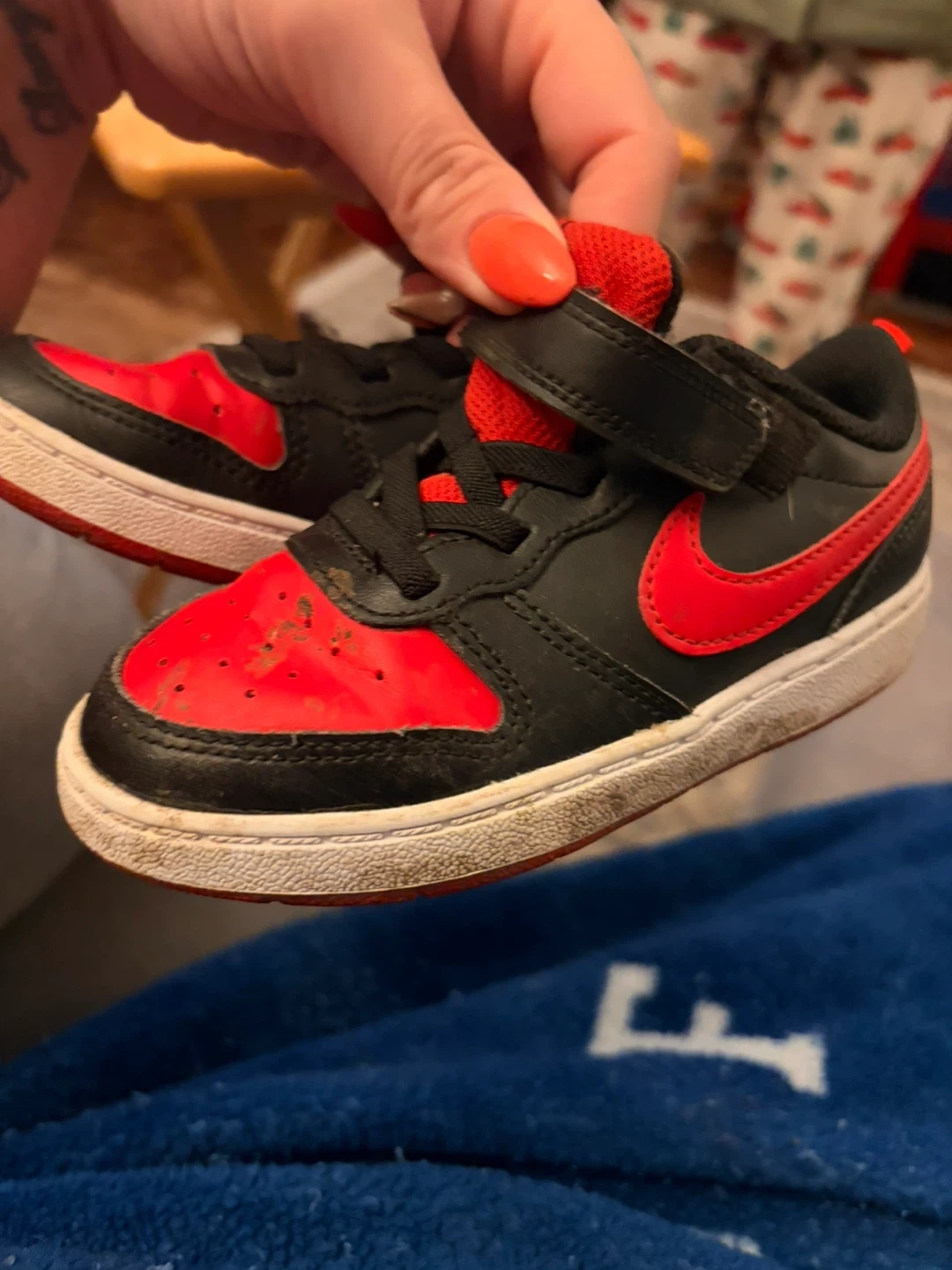 Black and red Nike sneakers for toddlers. Features velcro straps and laces for a secure fit. Perfect for little ones on the go!