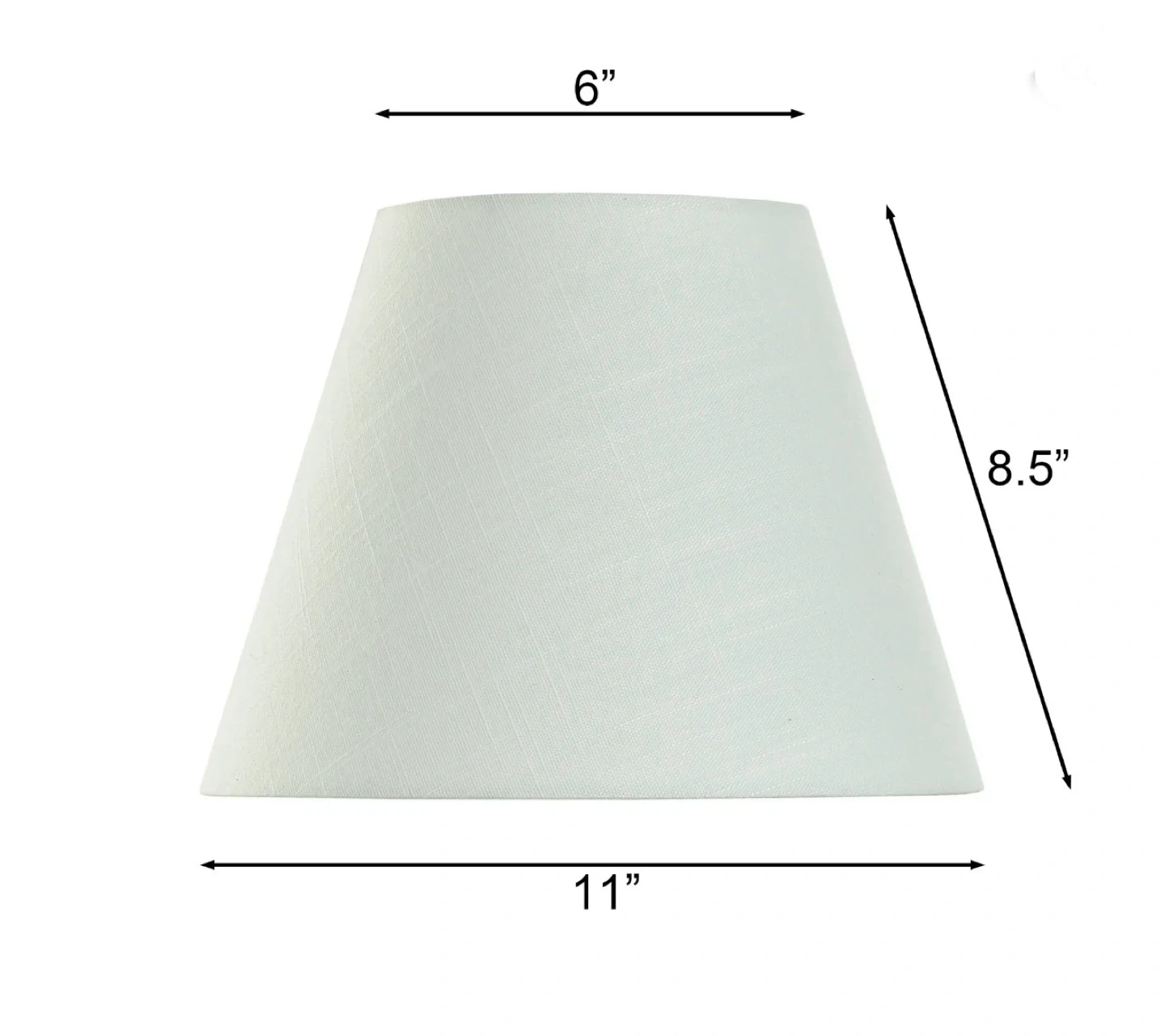 This is a white drum lamp shade. It's 11 inches across the bottom and 8.5 inches tall. The top opening is 6 inches wide.