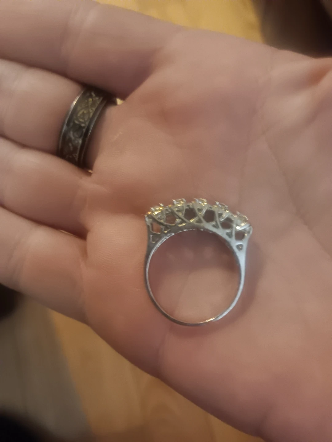 This ring features a delicate design with what appear to be accent diamonds. It's crafted from a silver-toned metal. The band has an intricate lattice pattern.