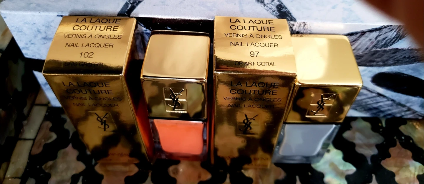Two Yves Saint Laurent Laque Couture nail lacquers, shades 102 Gris Graffiti and 97 Op Art Coral. $15 each or 25 for 2