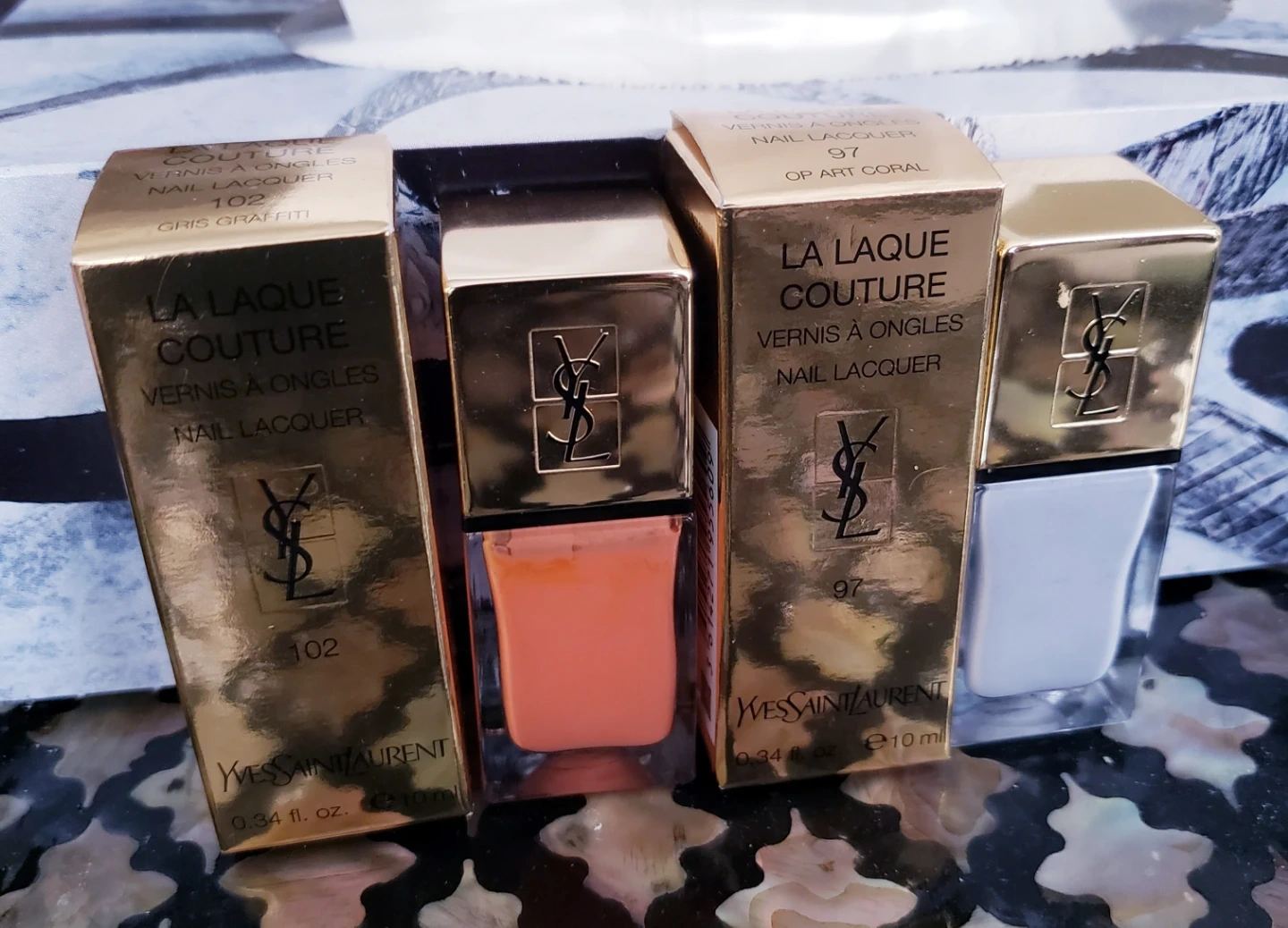 Two Yves Saint Laurent Laque Couture nail lacquers, shades 102 Gris Graffiti and 97 Op Art Coral. $15 each or 25 for 2