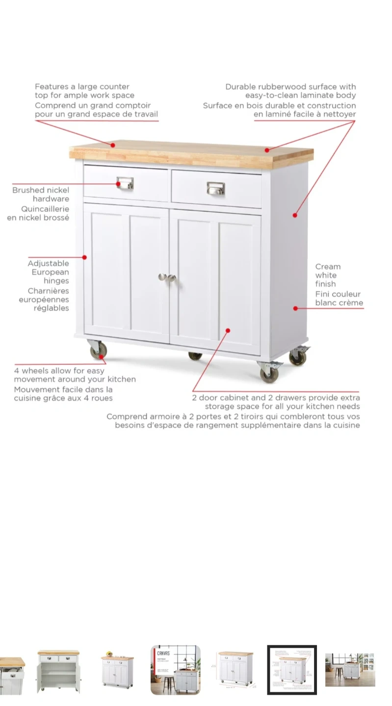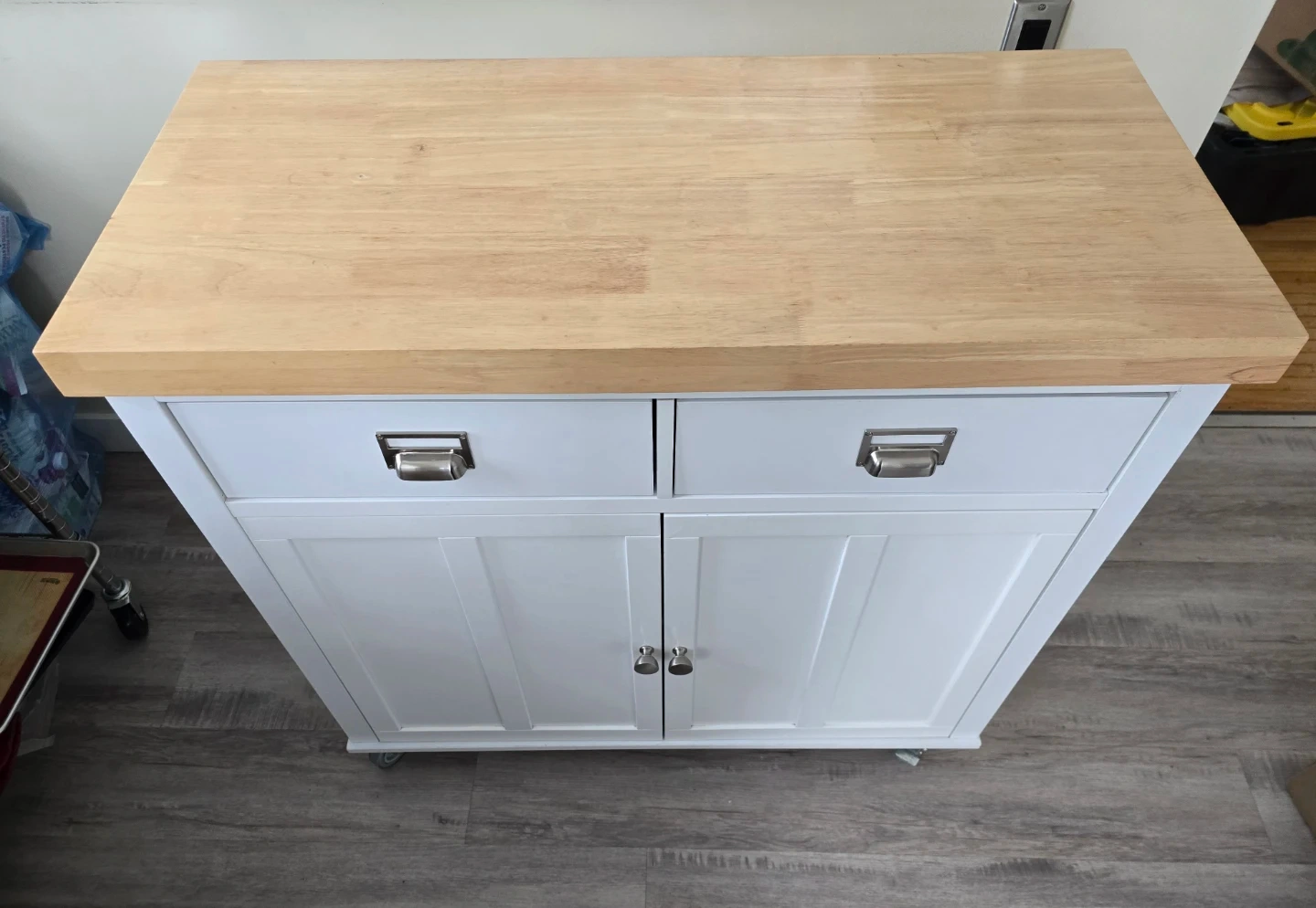 This kitchen island cart features a solid wood butcher block top and a white cabinet base. It has two drawers and a double-door cabinet for ample storage. The cart is on locking wheels for easy mobility.