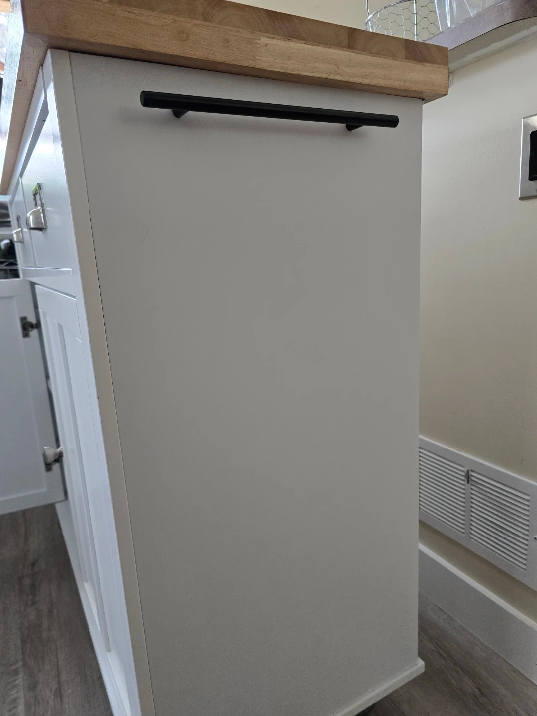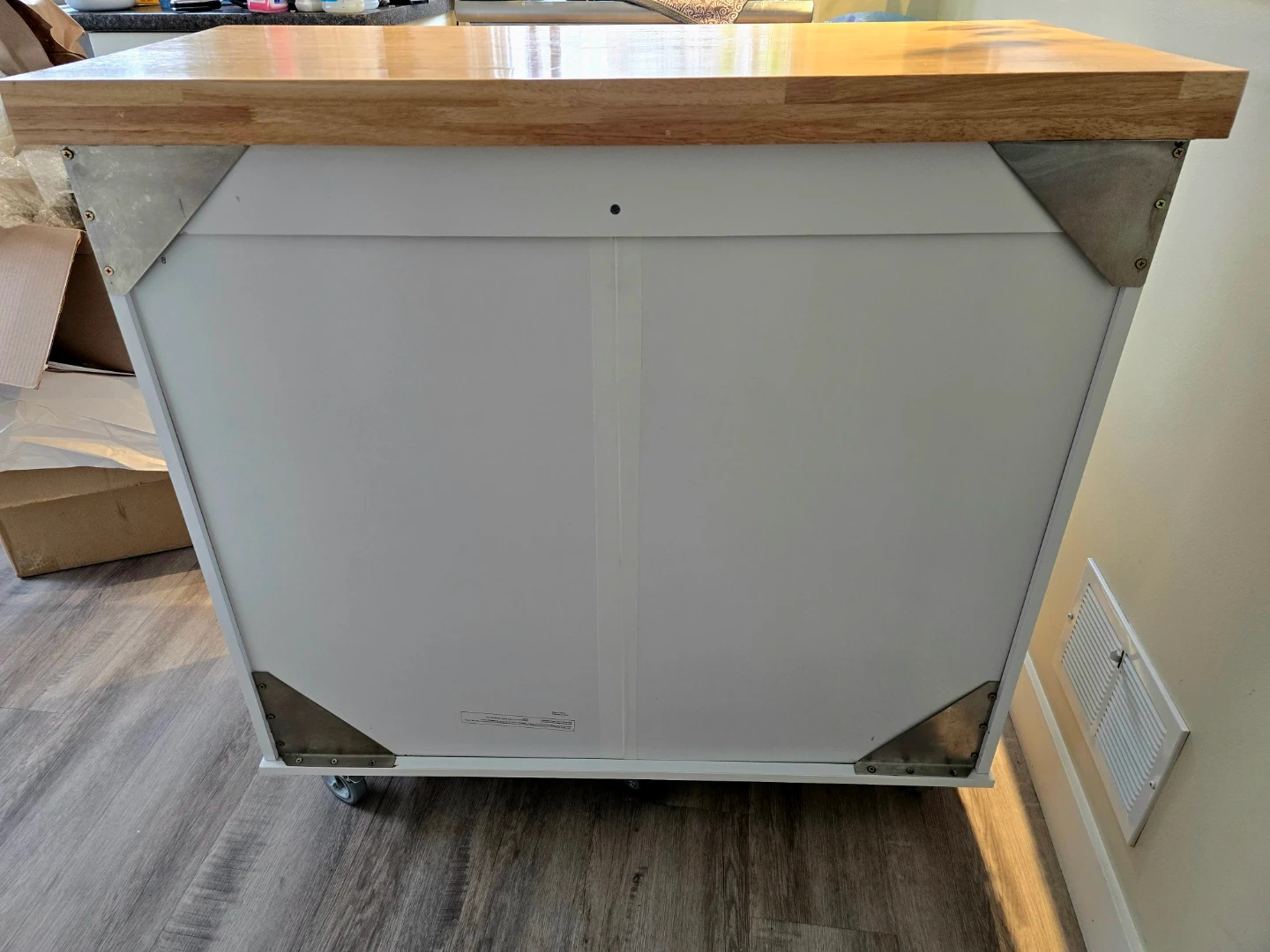 The cabinet has a few stains on the inside but the exterior is in good condition. The cart has the following custom additions: reinforced metal corner brackets on the back, reinforced cabinet door connection, extra wheel in the center, and added black metal handles/drying rod on each end of the cart.
