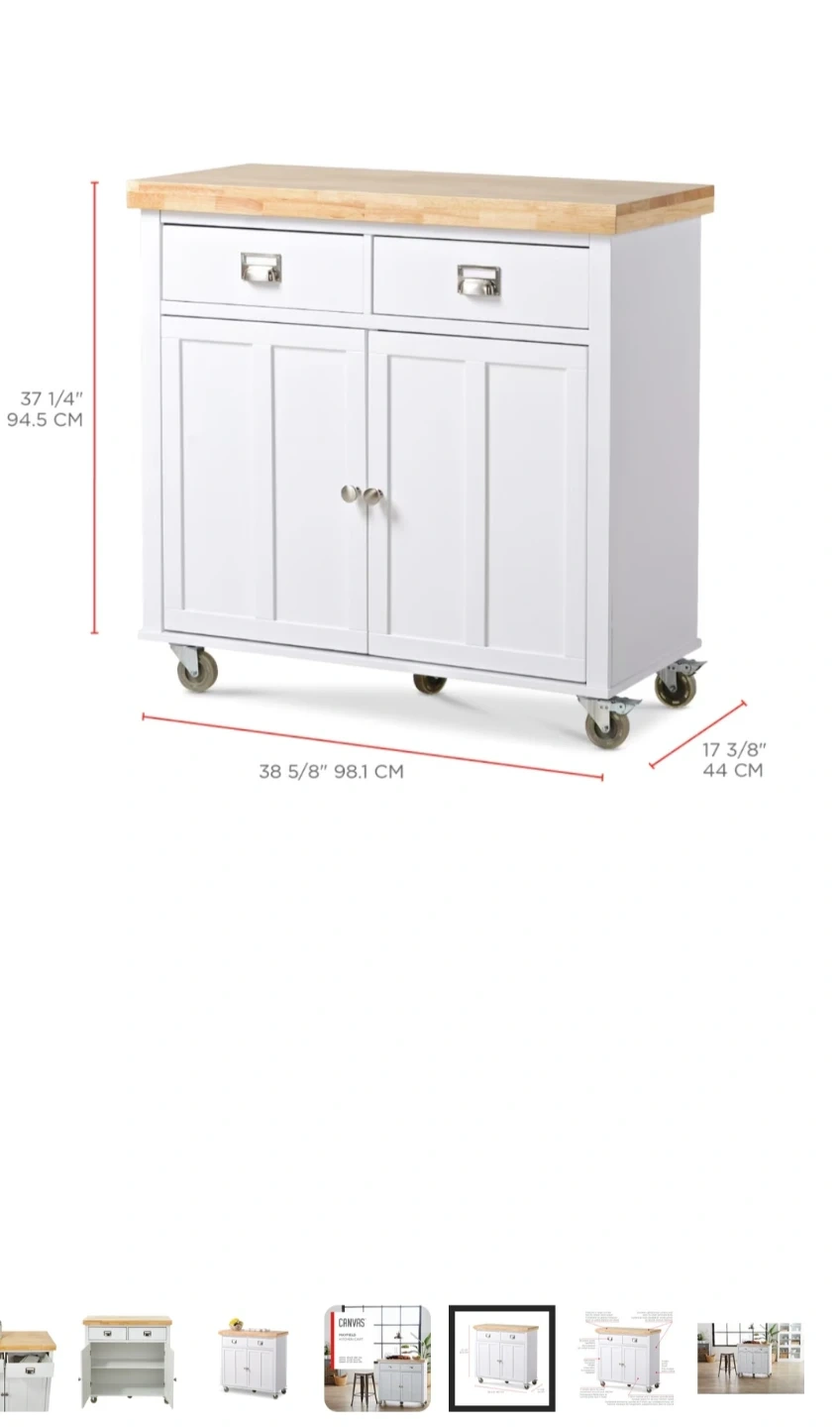 This kitchen island cart features a solid wood butcher block top and a white cabinet base. It has two drawers and a double-door cabinet for ample storage. The cart is on locking wheels for easy mobility.