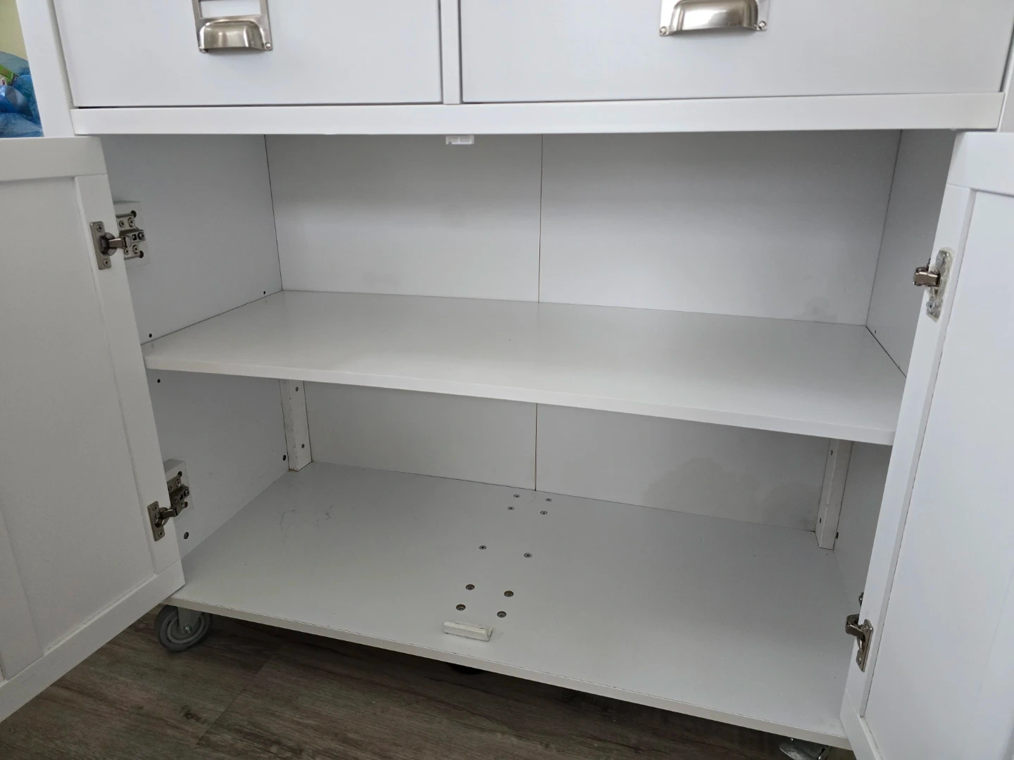 The cabinet has a few stains on the inside but the exterior is in good condition. The cart has the following custom additions: reinforced metal corner brackets on the back, reinforced cabinet door connection, extra wheel in the center, and added black metal handles/drying rod on each end of the cart.