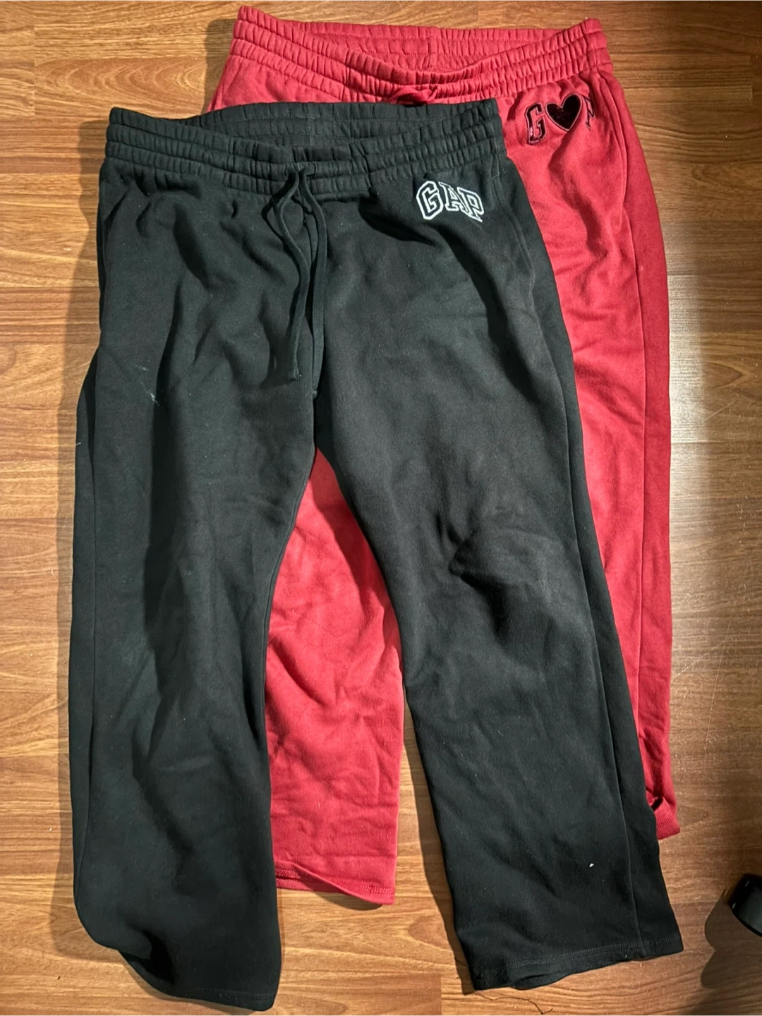 Two pairs of comfy sweatpants up for grabs! One is a classic black GAP pair, and the other is a red pair with a cute heart detail. Both are in