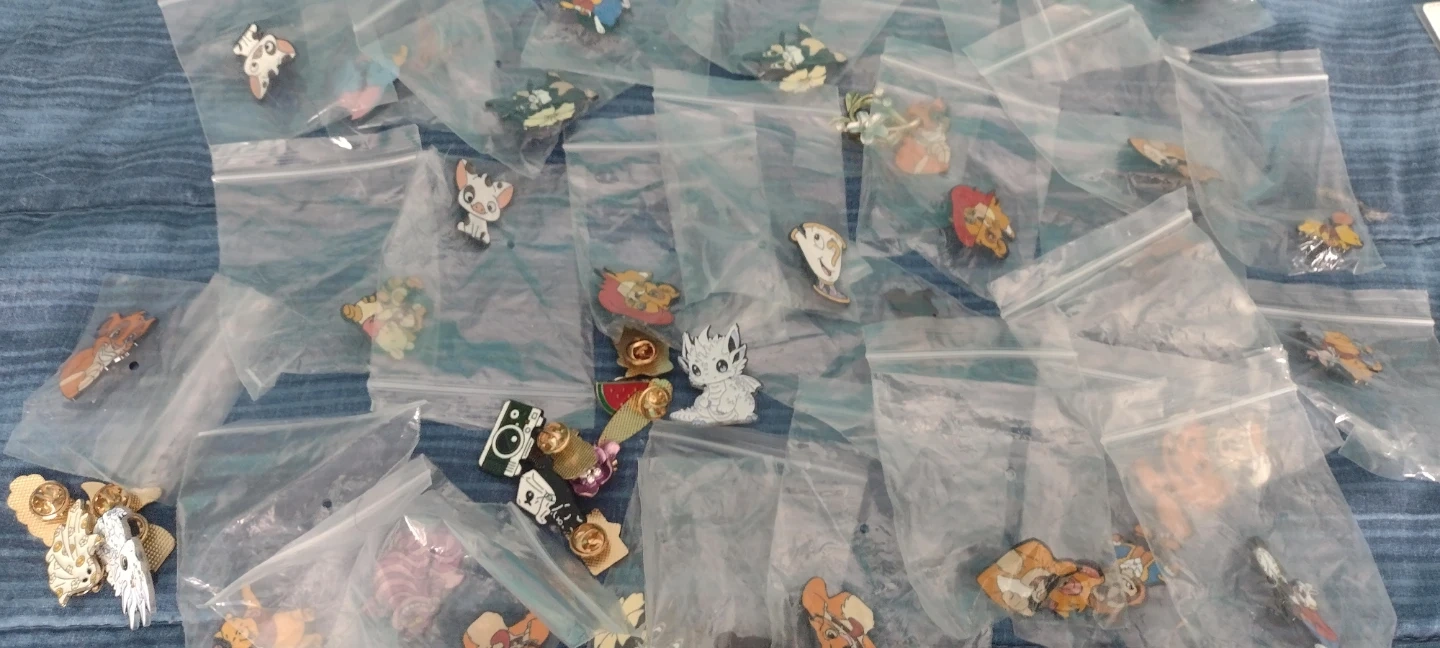 Collection of assorted enamel pins featuring various characters. Each pin is individually bagged and ready to be displayed or worn. These collectible pins come in a variety of fun designs. 10 for $5. Great to add that touch to s Party favor bag, Gift Bag and Gift Basket.