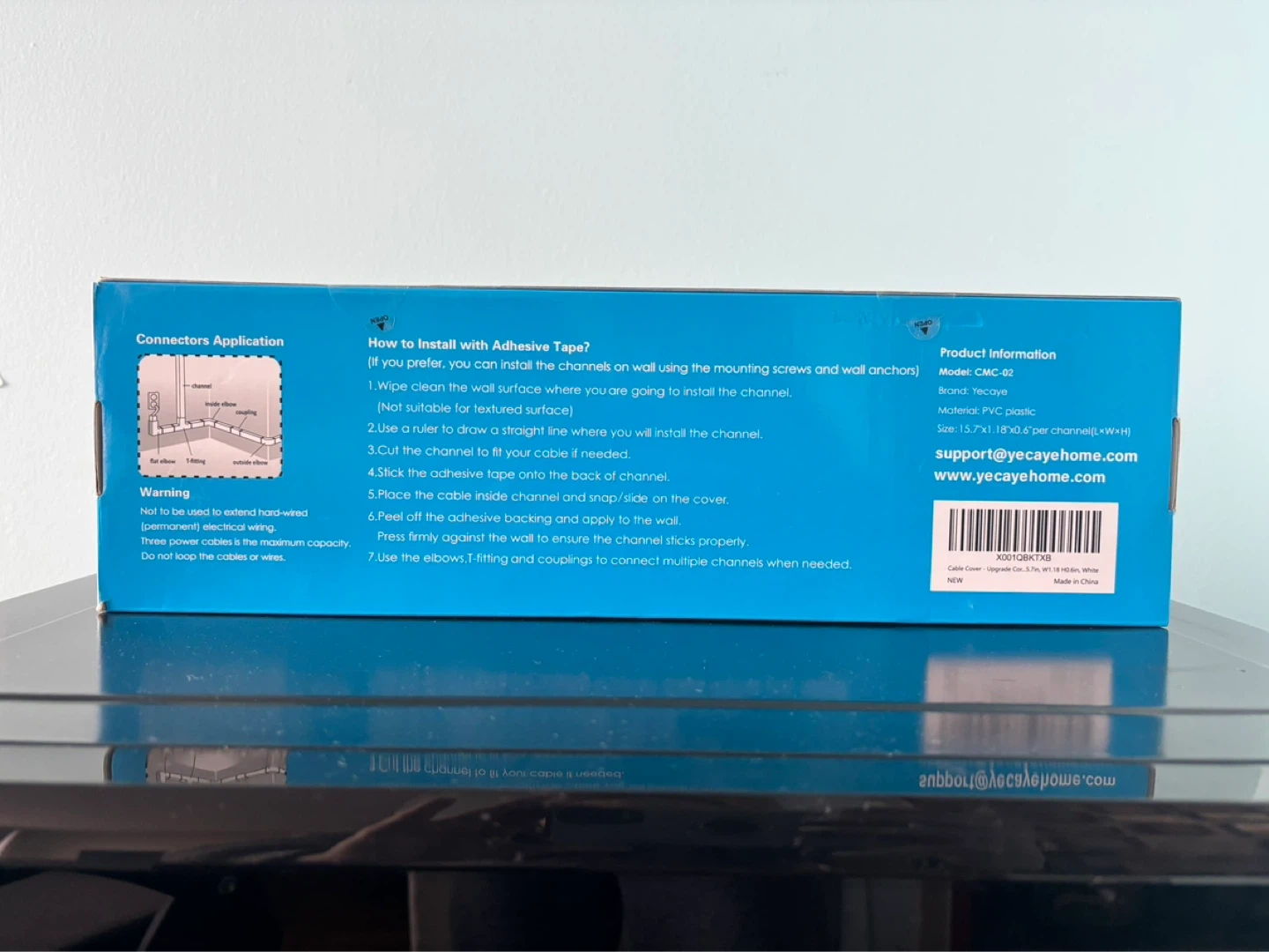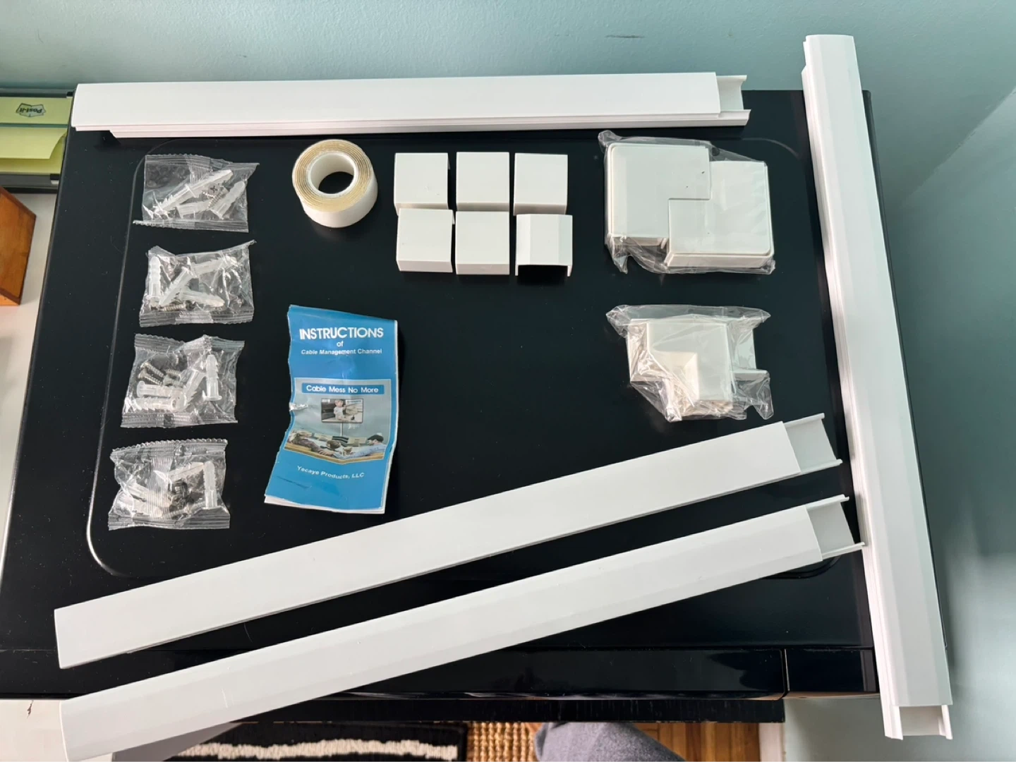 White paintable PVC cable management channel set. Includes 8 channels, 7 couplings, 4 flat elbows, 4 outside elbows, 4 inside elbows, adhesive tape, mounting screws, and wall anchors. Great for organizing TV and home entertainment system cables! Opened the box but then decided not to use this!