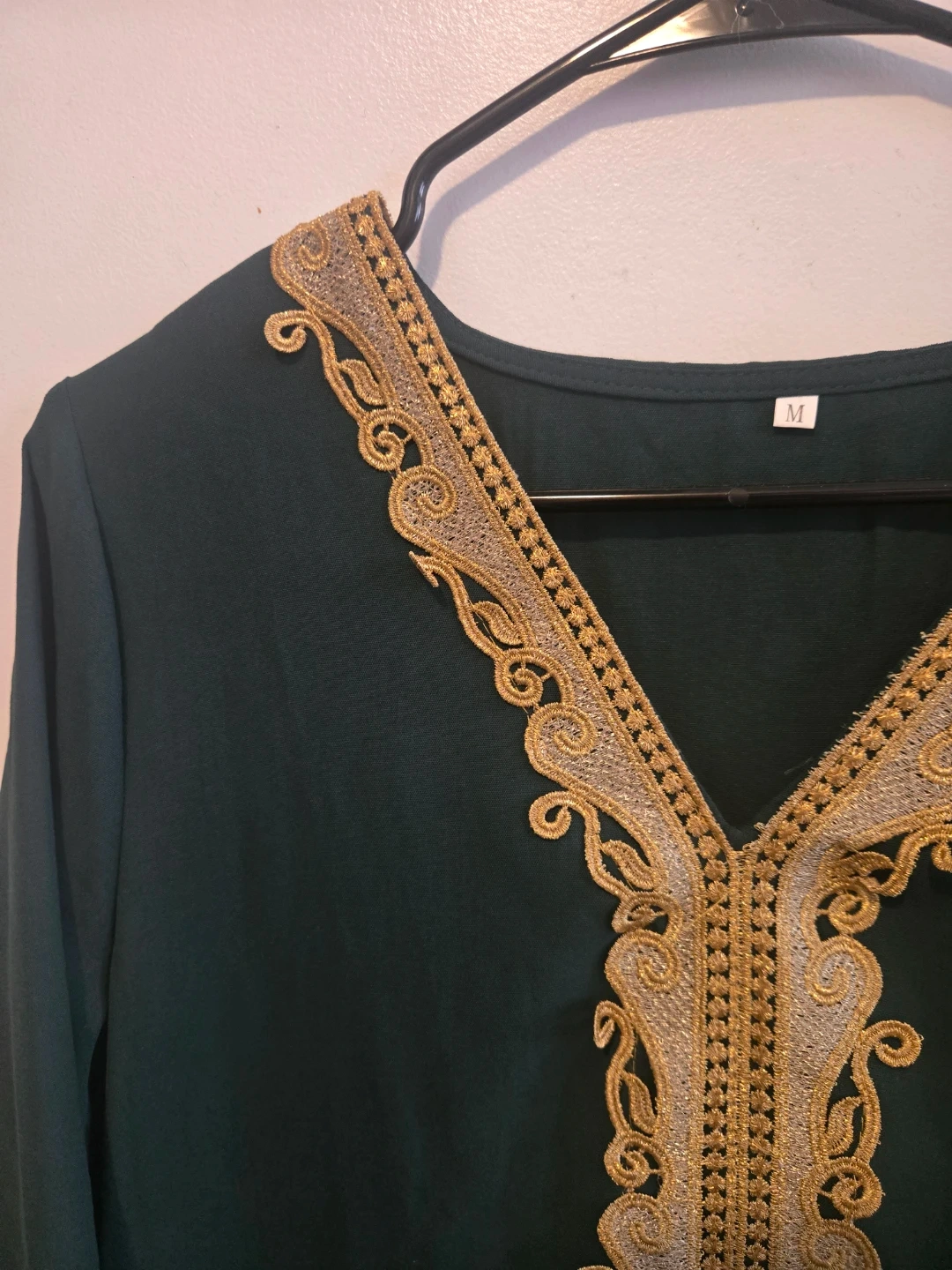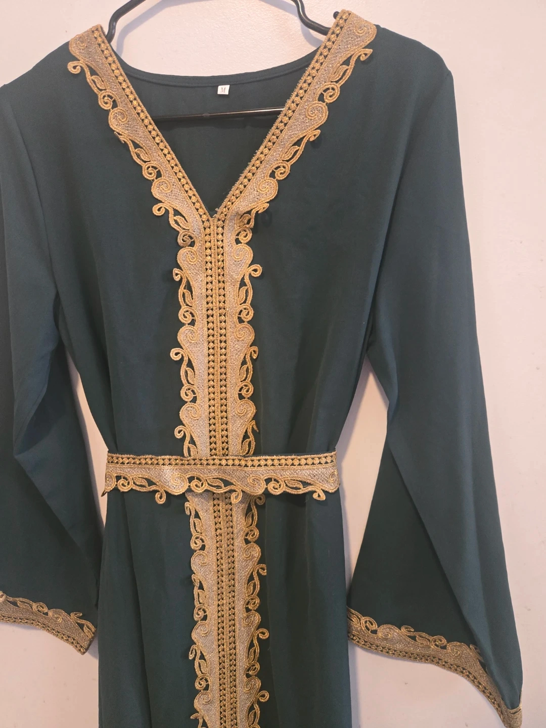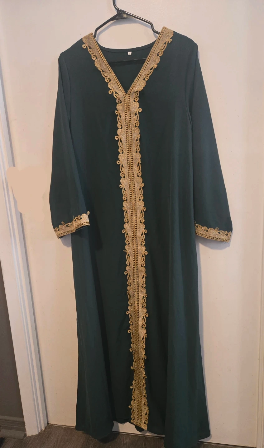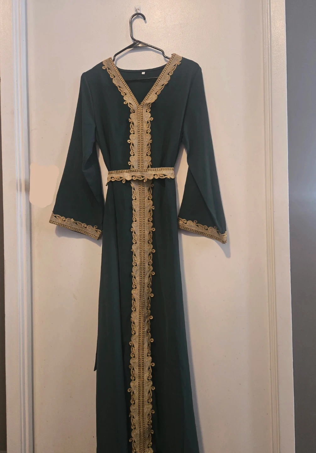 Selling this brand new with no tags. Very cute abaya or kaftan dress, flowy green with gold embroidery and matching belt. Size medium.