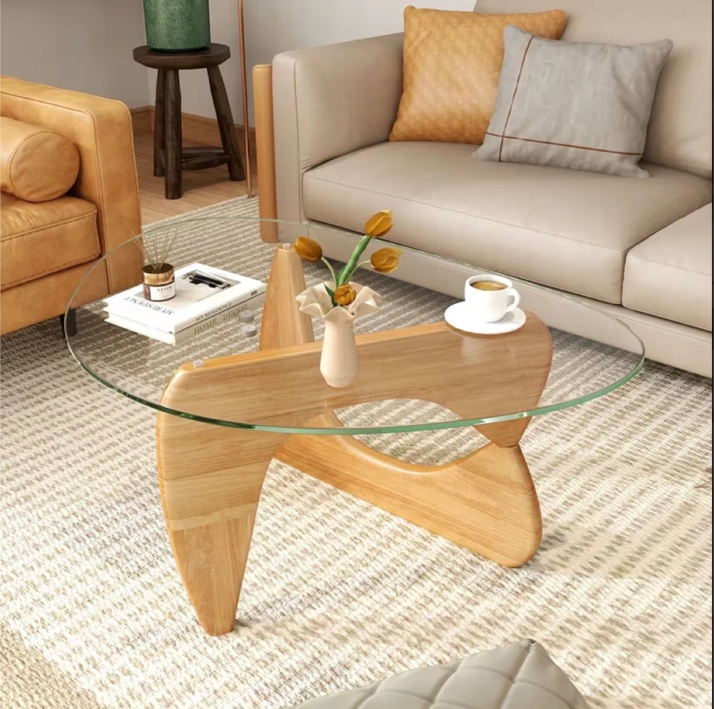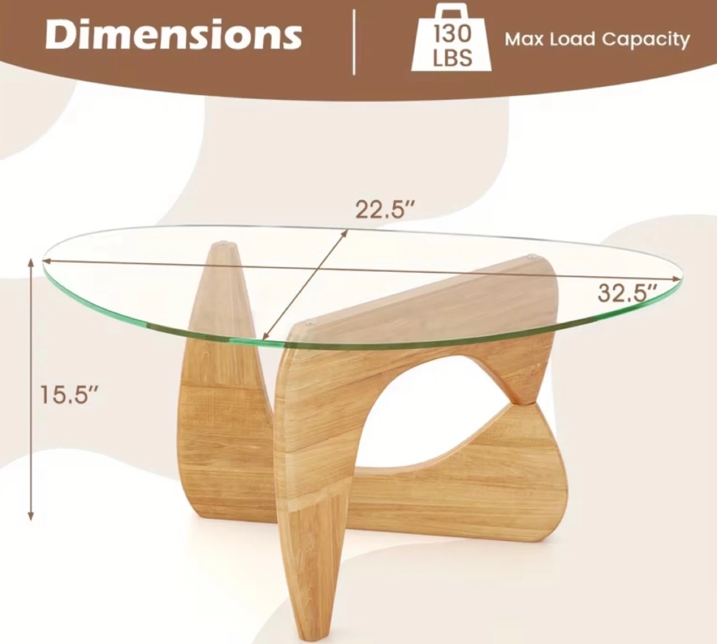 This coffee table features a clear glass top and a unique, sculptural wood base. It has a diameter of 32.5 inches and a height of 15.5 inches.