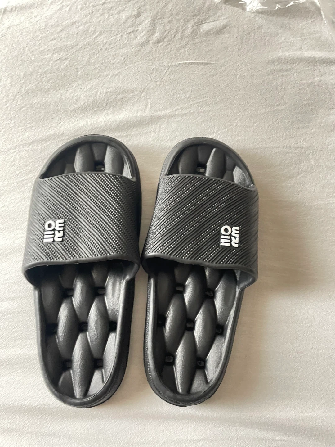 These black slides have a textured footbed and strap. They're made of a durable material. Perfect for casual wear or after sports!