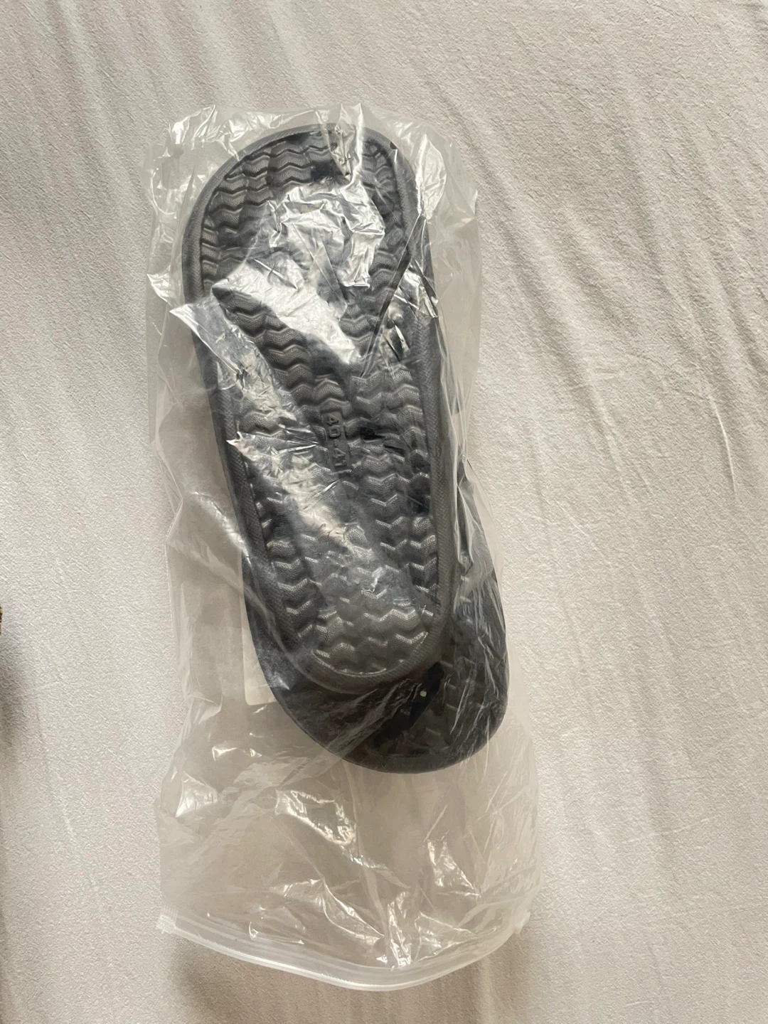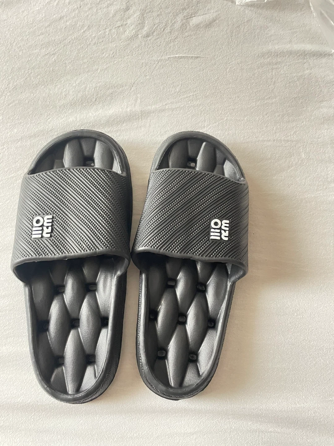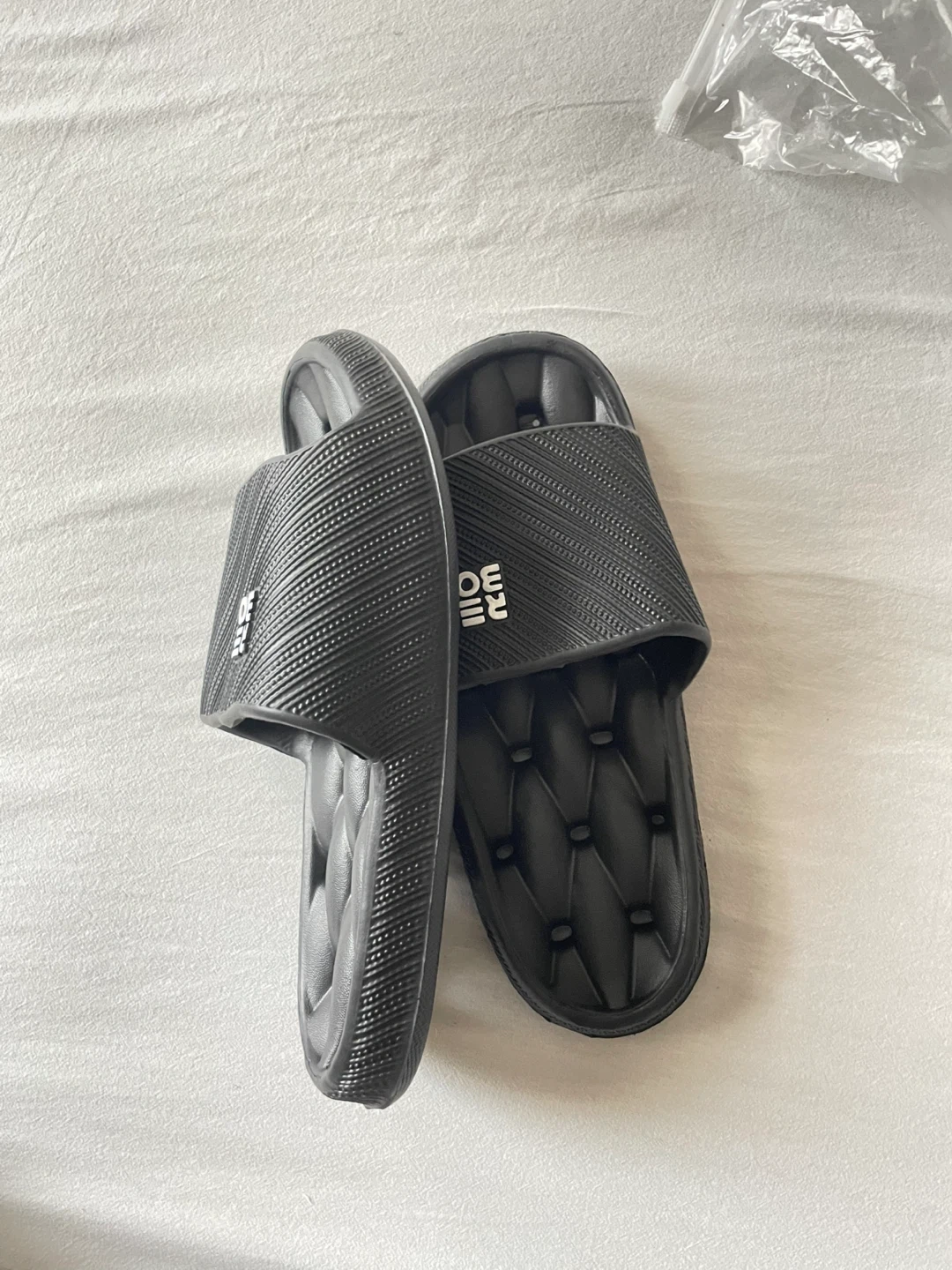 These black slides have a textured footbed and strap. They're made of a durable material. Perfect for casual wear or after sports!