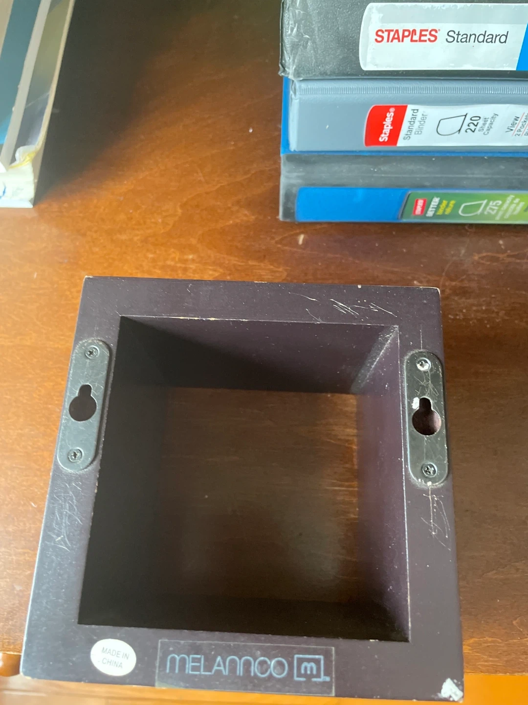 A small dark brown display shelf by Melannco. It's made in China and features mounting holes on the back. Perfect for displaying small decorative items!