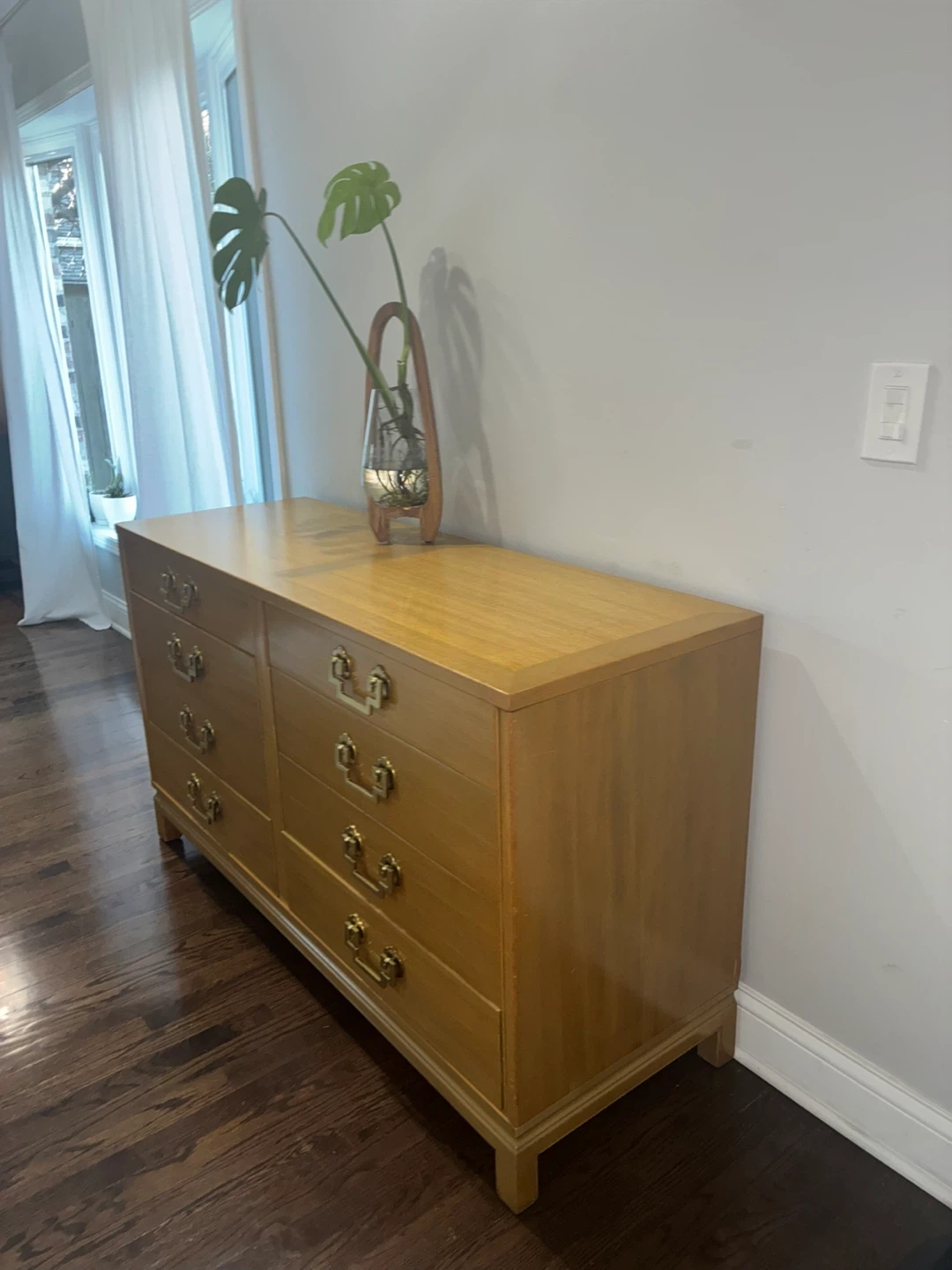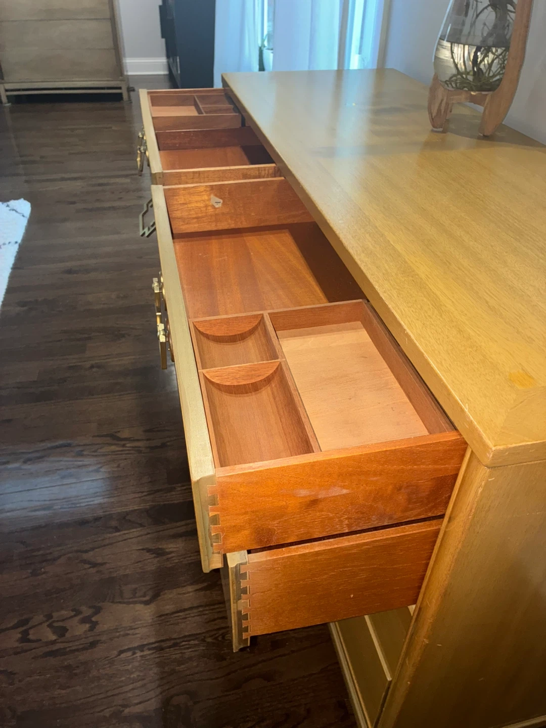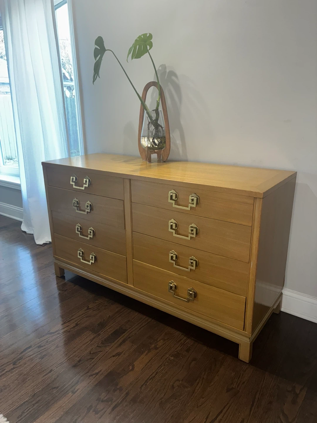 Mid century modern dresser by marshals field company. Solid wooden drawers with brass handles. Normal vintage wear.