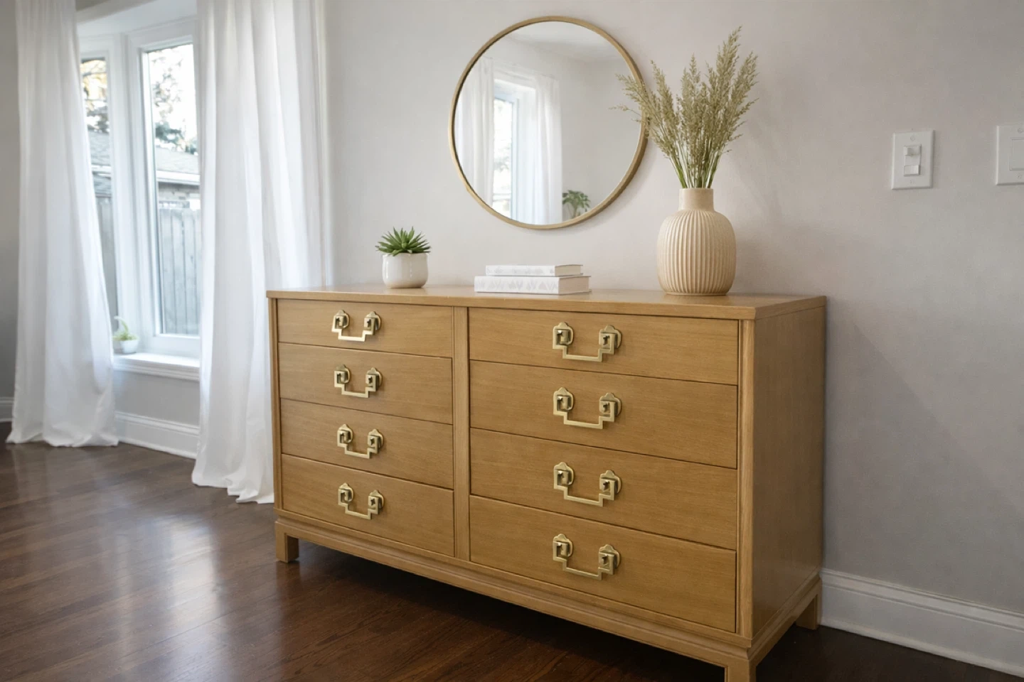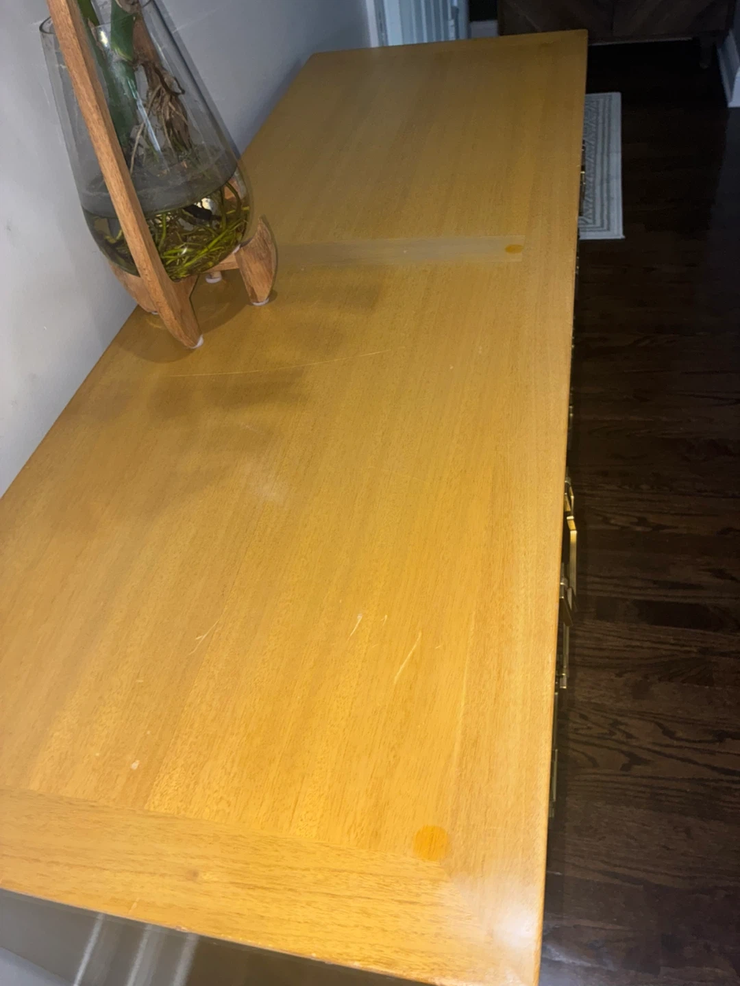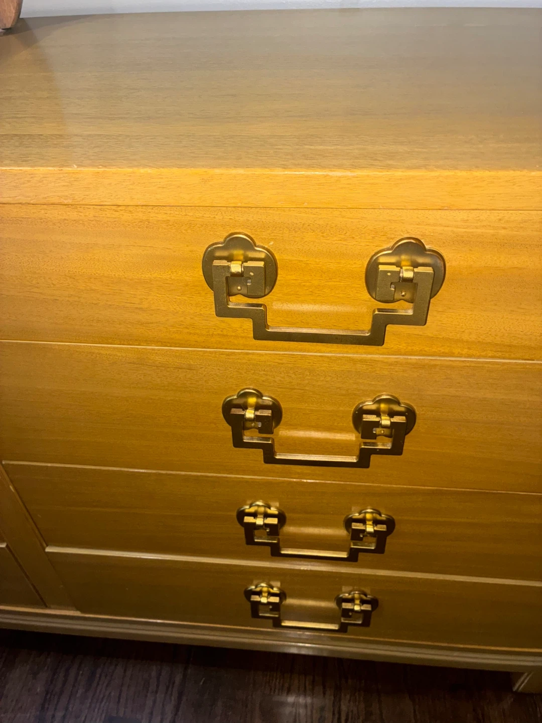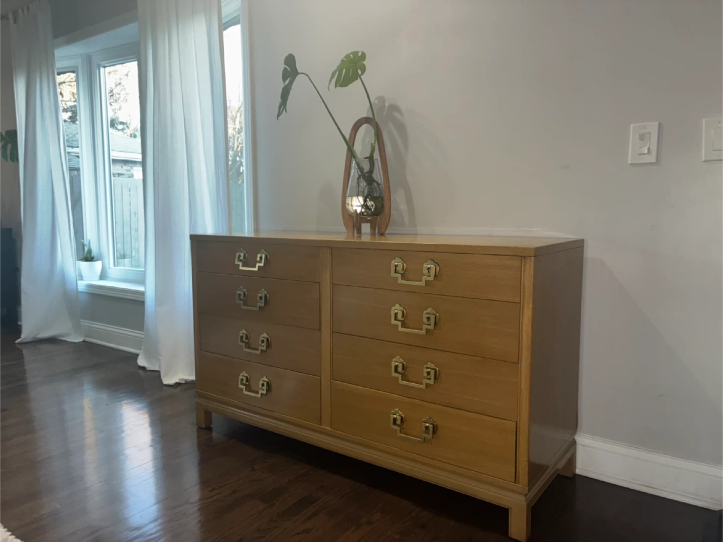 Mid century modern dresser by marshals field company. Solid wooden drawers with brass handles. Normal vintage wear.
