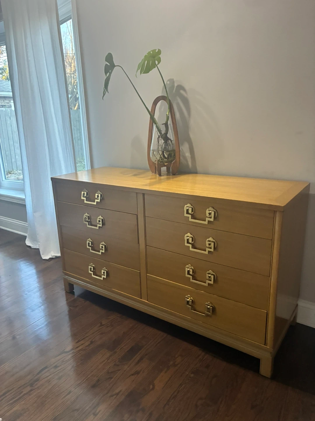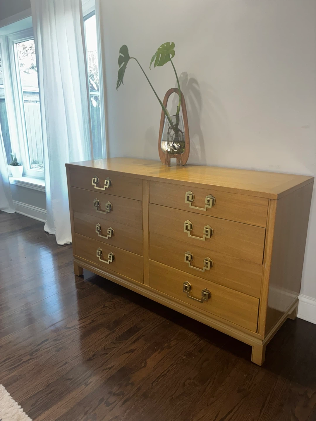 Mid century modern dresser by marshals field company. Solid wooden drawers with brass handles. Normal vintage wear.