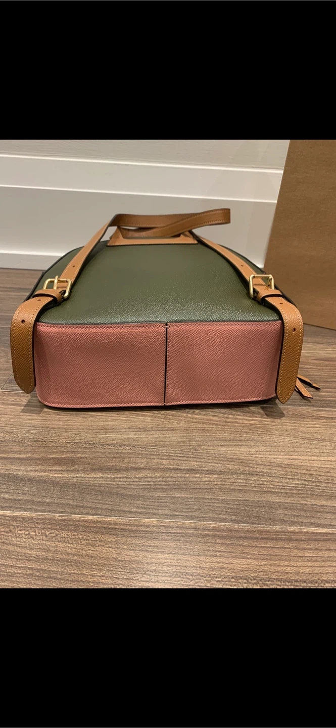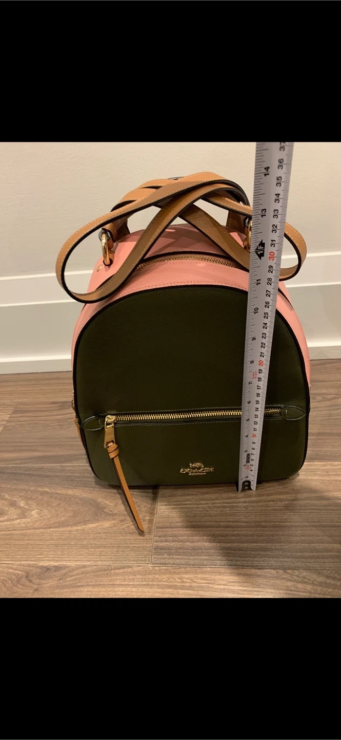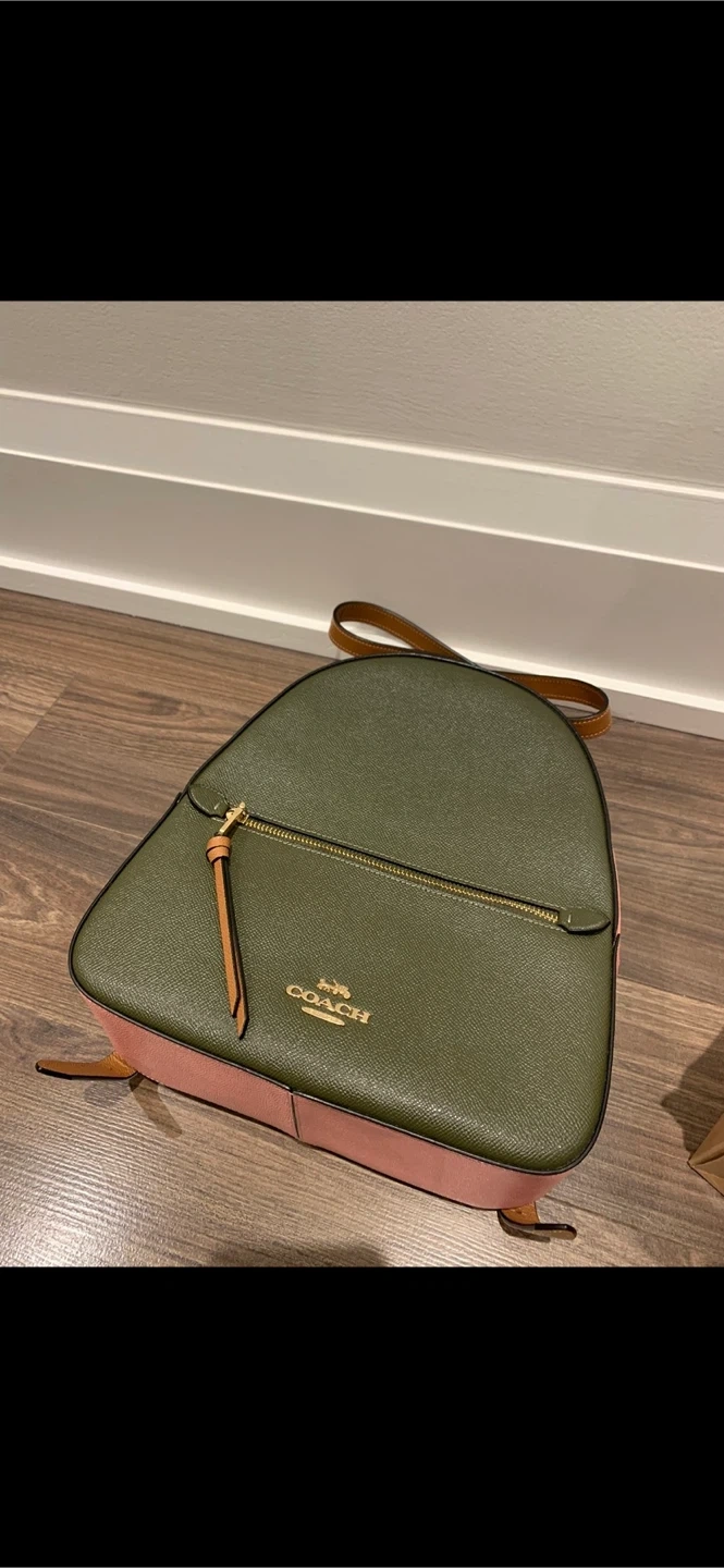 This is a stylish Coach backpack in a two-tone design. It features a pink front and an olive green back with tan leather straps and gold hardware. Includes the original Coach dust bag and box. It's a great accessory for everyday use!