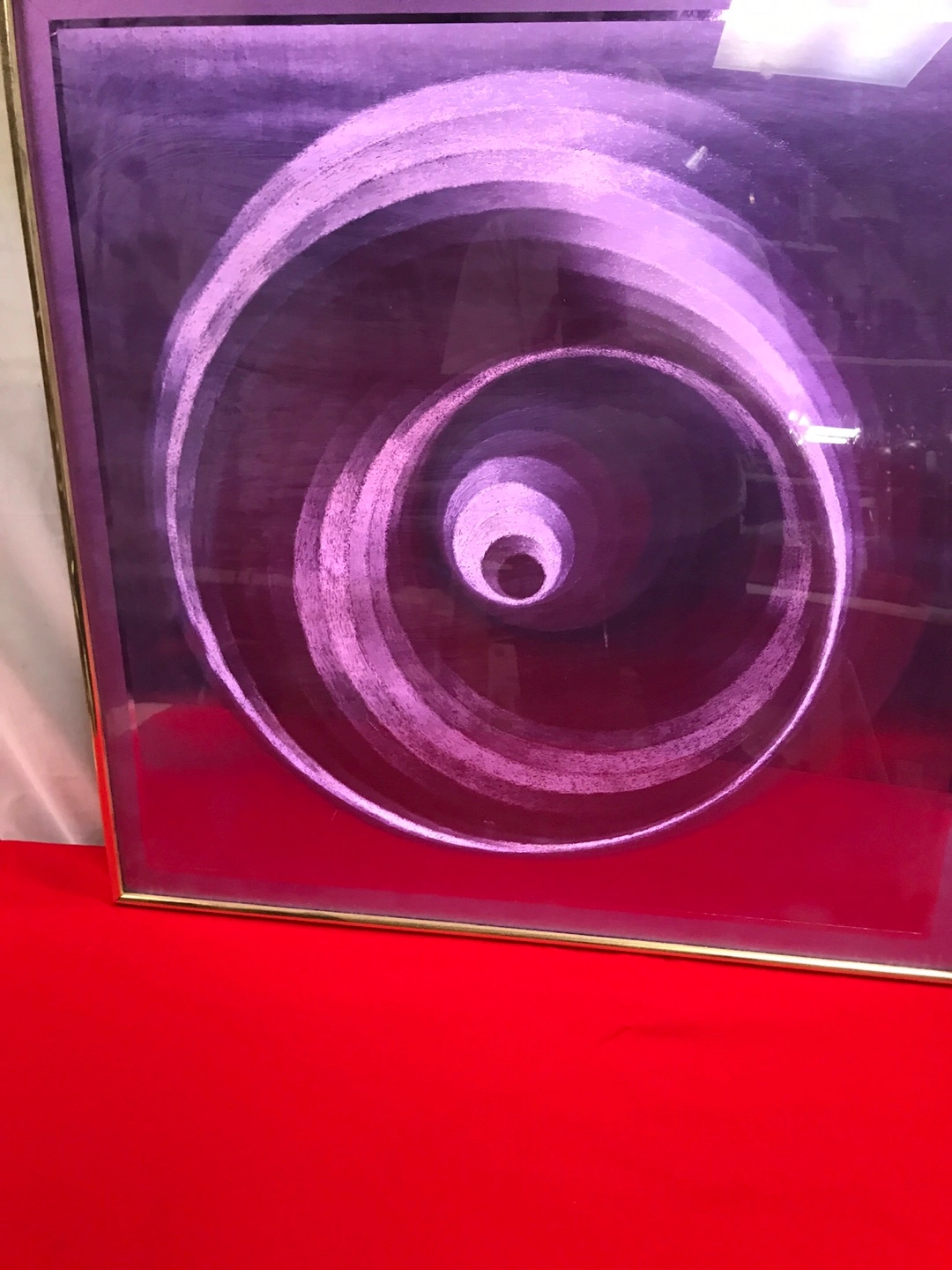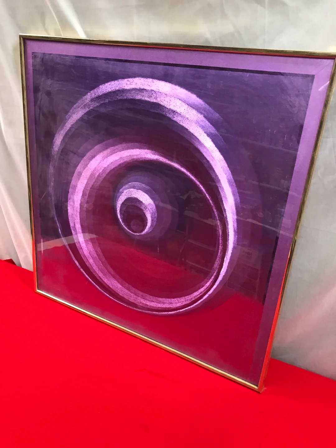 Selling a framed piece of art titled "Poster Magic" by Manifestations Gallery. It features a captivating optical illusion design in shades of purple and white. A unique addition to any home or office! 24” x 24”