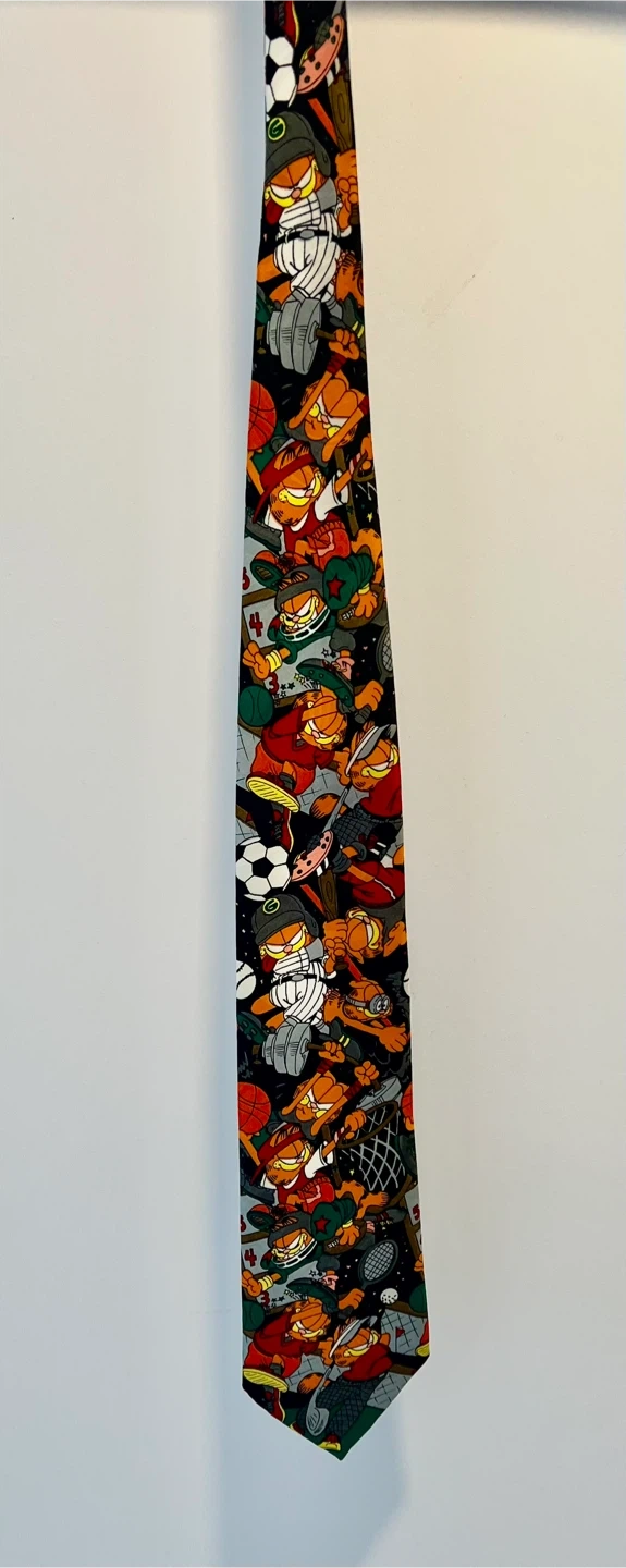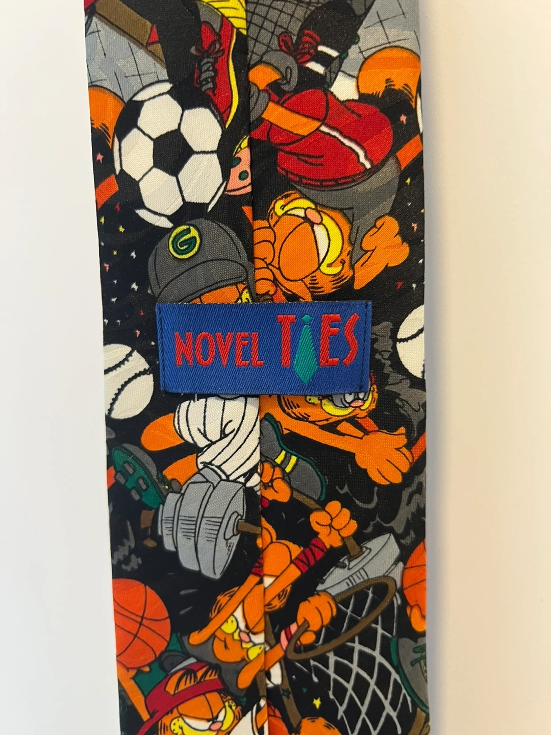 Vintage 1980’s. This Novel Ties necktie features Garfield in various sports. It's made from a silky material and has a playful, all-over print.