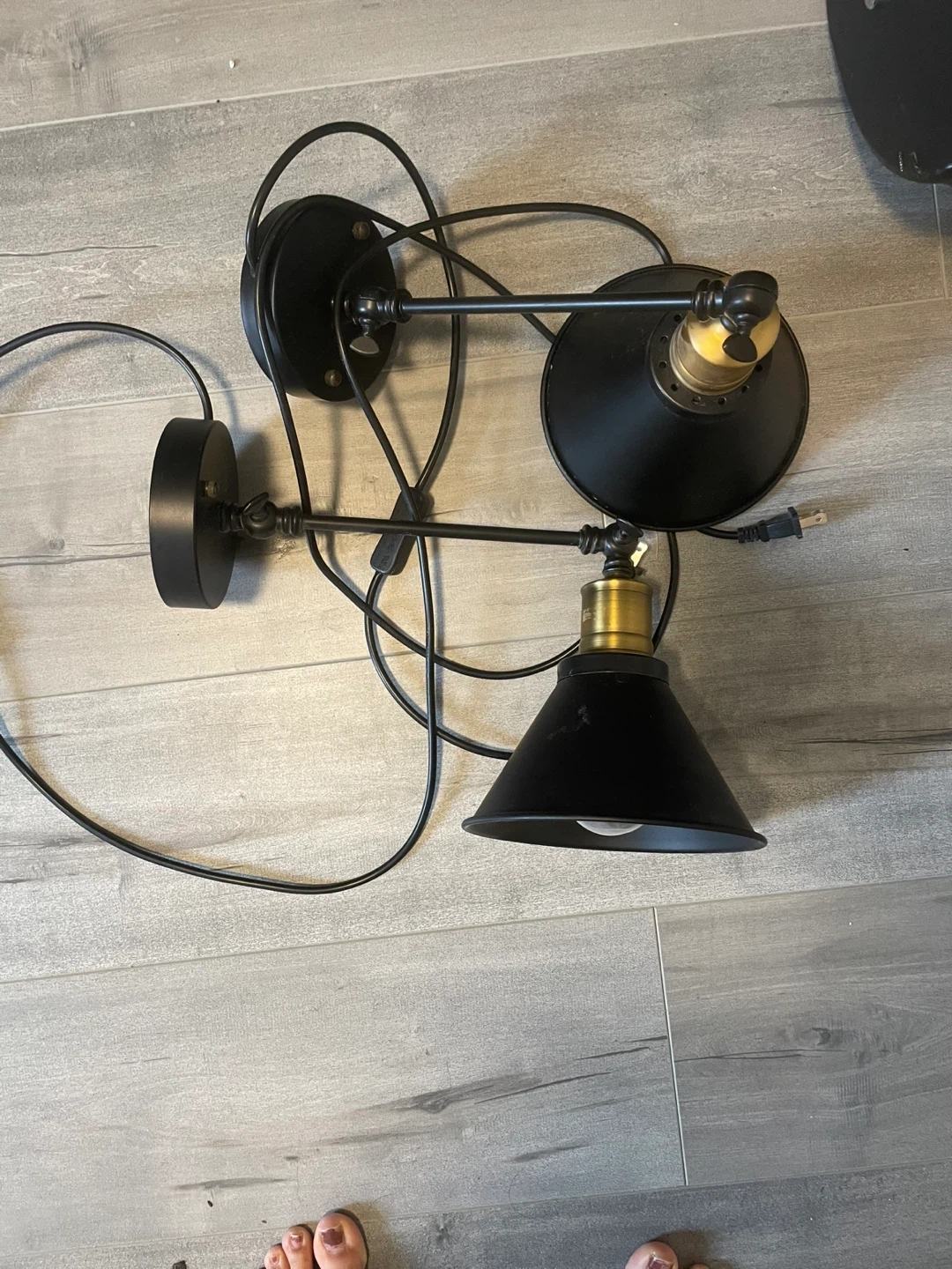 Adjustable plug-in wall sconce with a black metal cone shade and brass accents. It has a pivoting arm for easy adjustment. Can be hardwired or just mounted with a screw.